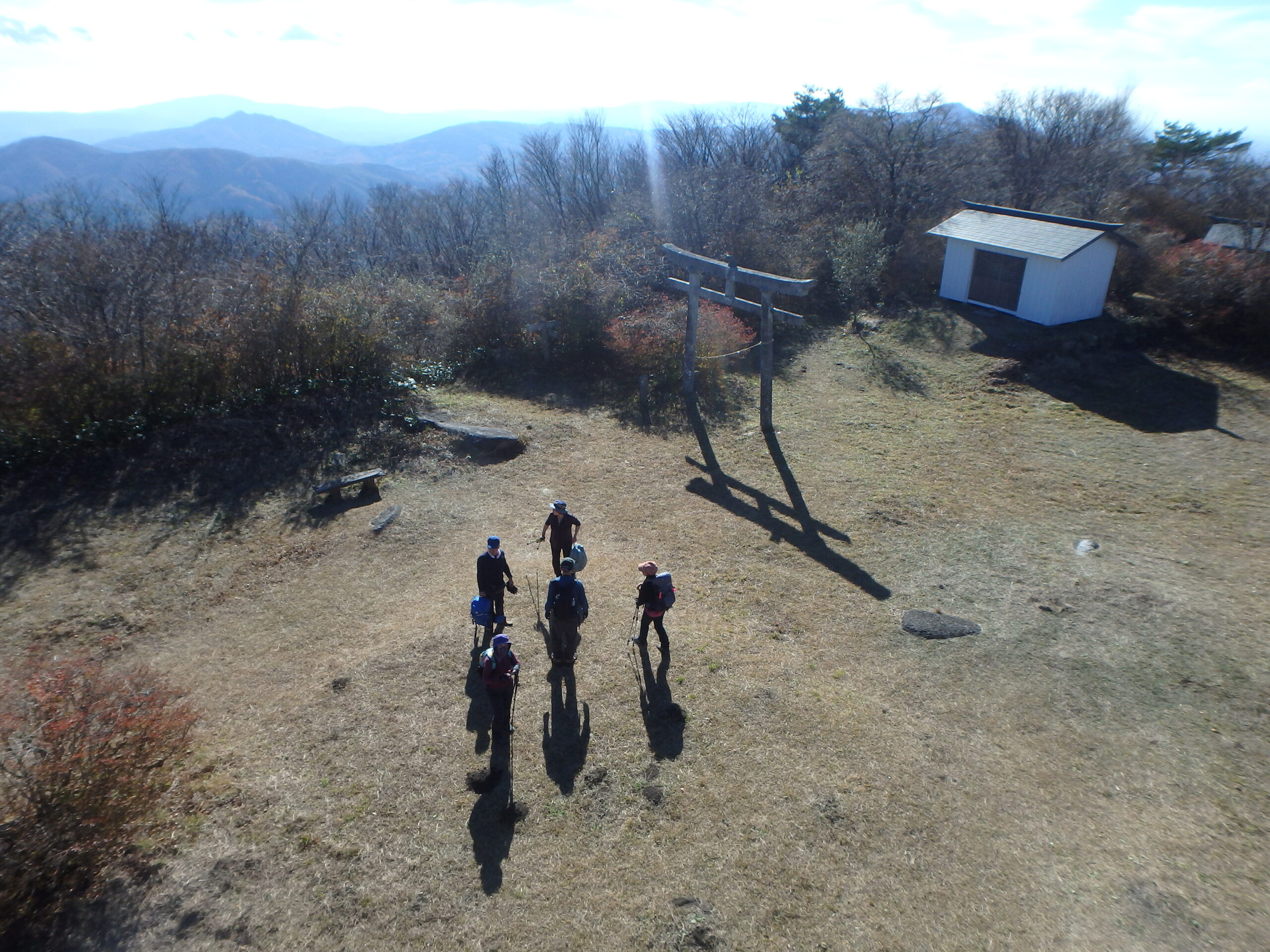 展望台から山頂広場。山頂には田沢、茂原、葛尾の三地区の社が建ち、右奥に見えるのはその内の二つらしい。
