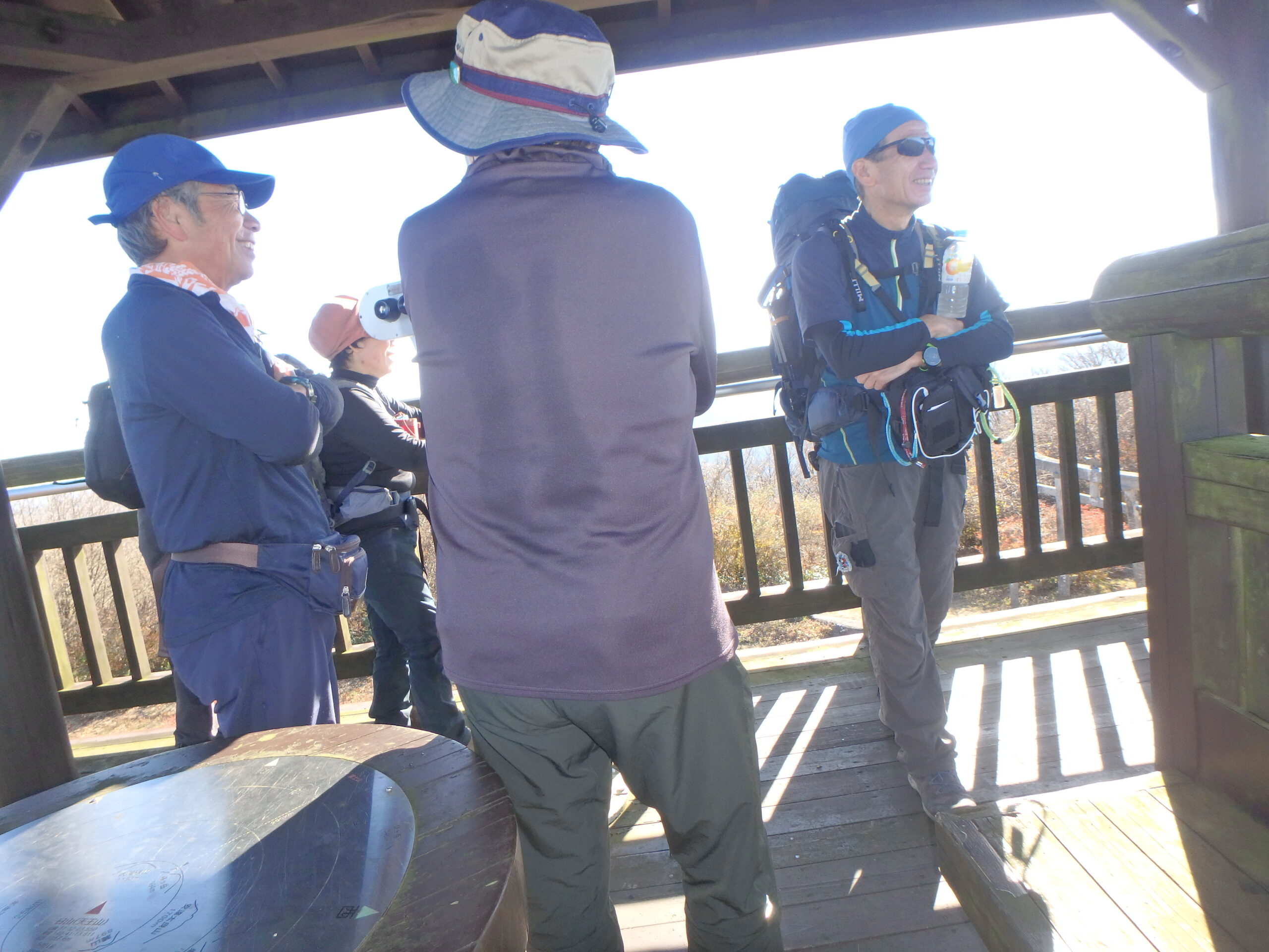 富士山の見える北限の山なので、みな富士探し。この望遠鏡は冨士が見えるように設置されていると会長が言うので覗いてみても見えるのは雲ばかりで、ちょっと力を入れたらガクッと動いた。固定されているわけでもなく、富士に標準が合っているわけでもなく、自力で探すしかない富士はよほど天気の良い日でないと見えないらしい。
