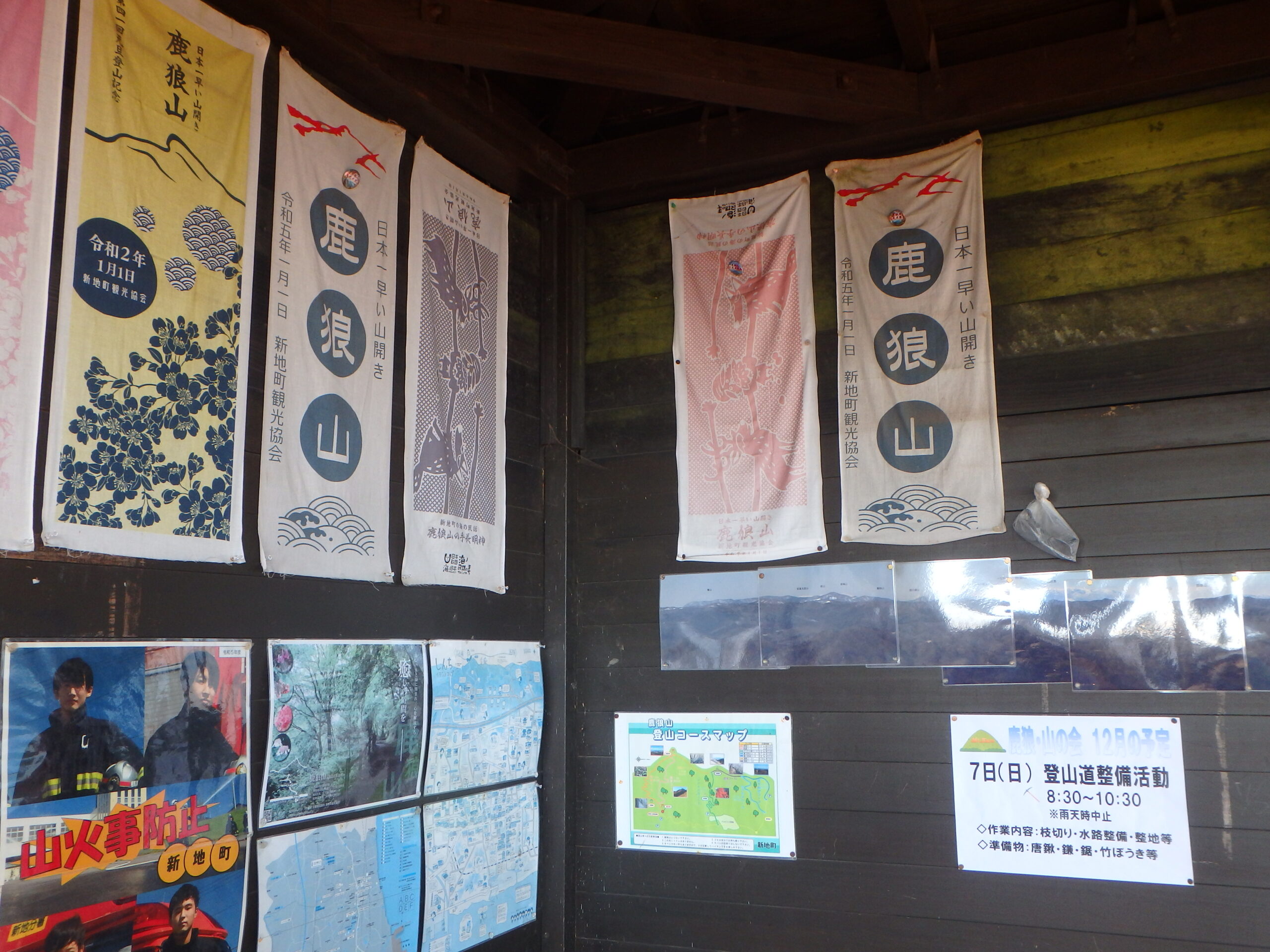 頂上直下の休憩小屋。日本一早い山開きとは元旦で、毎年記念の手拭を出すようだ。