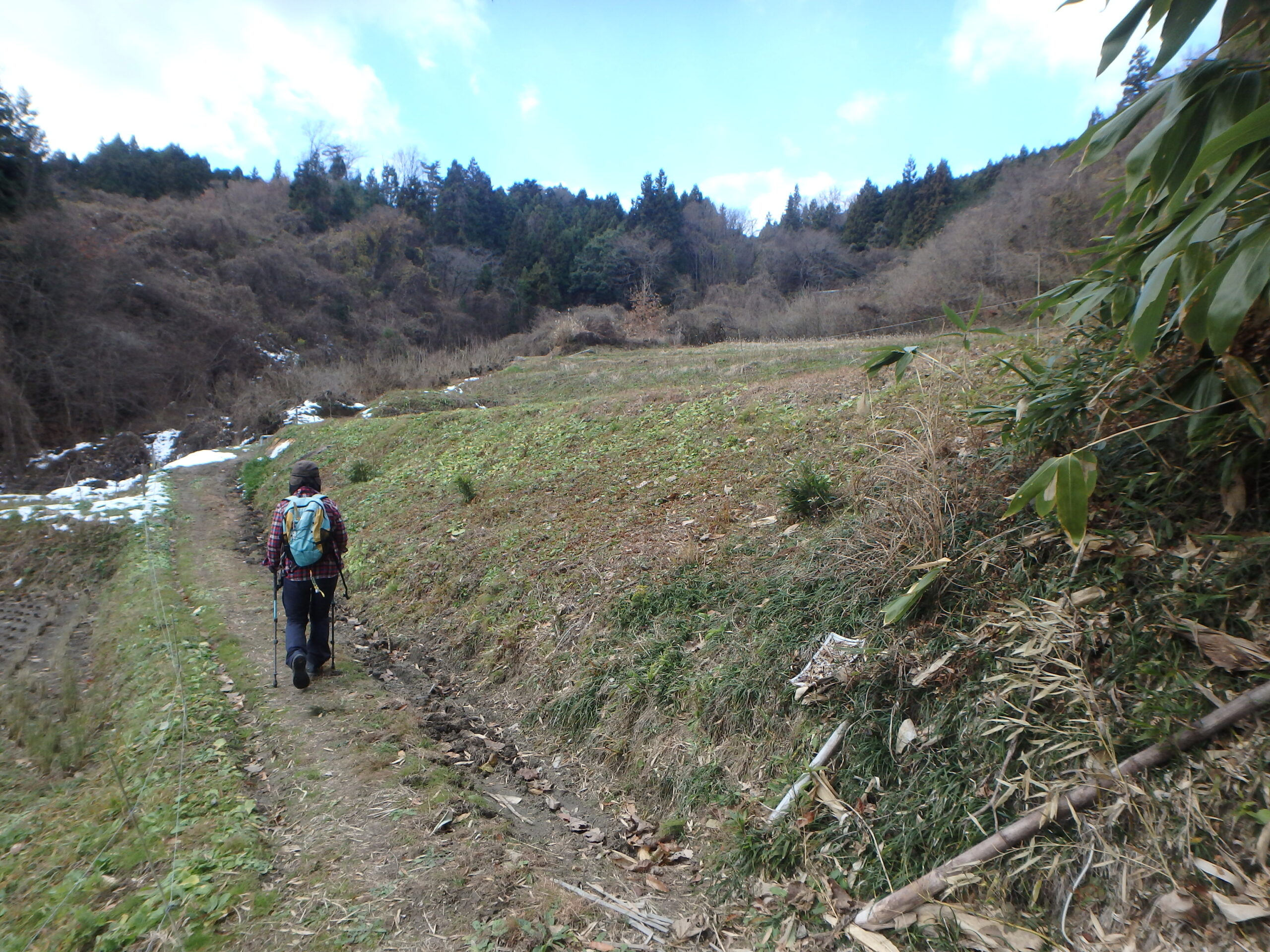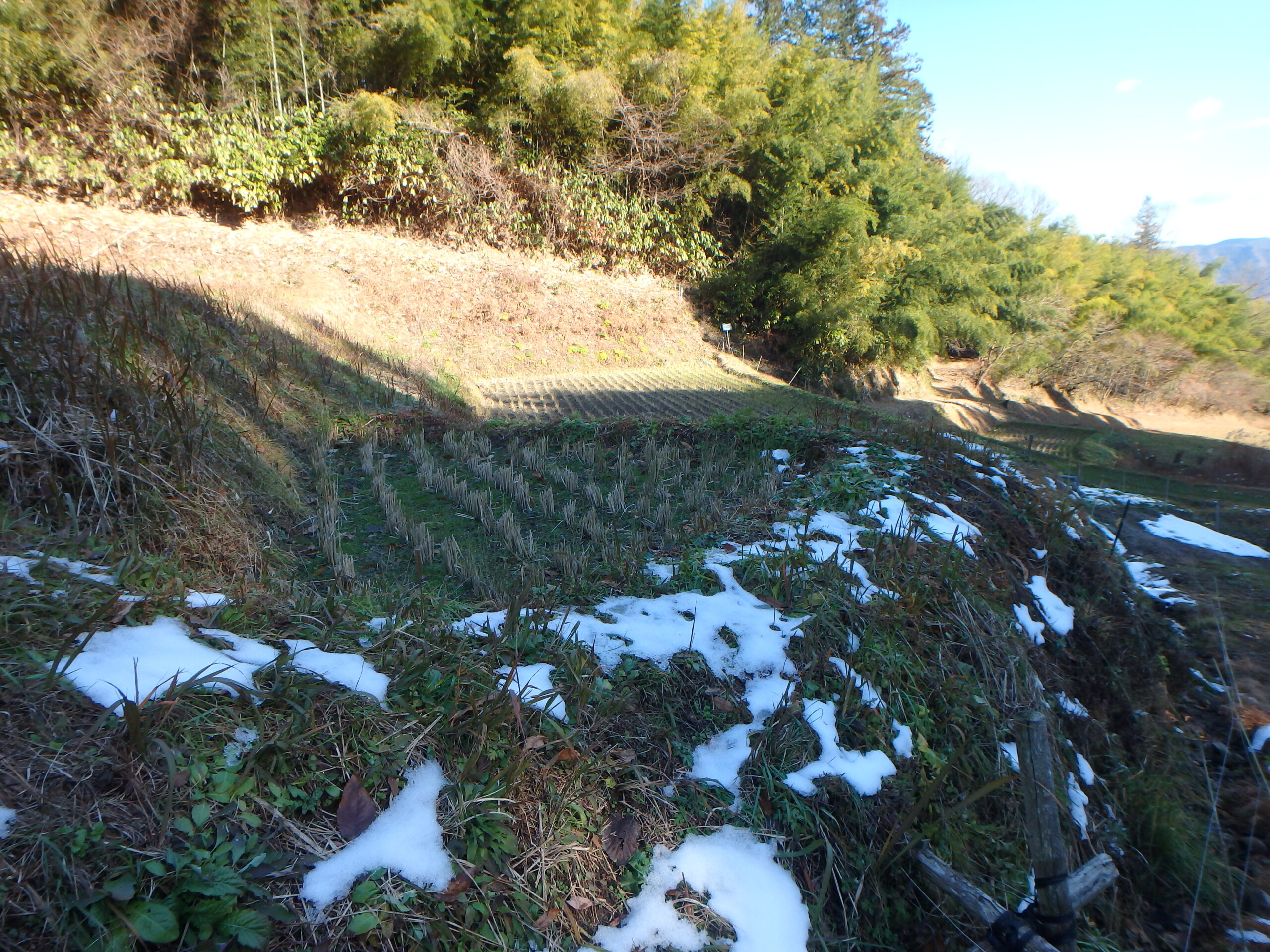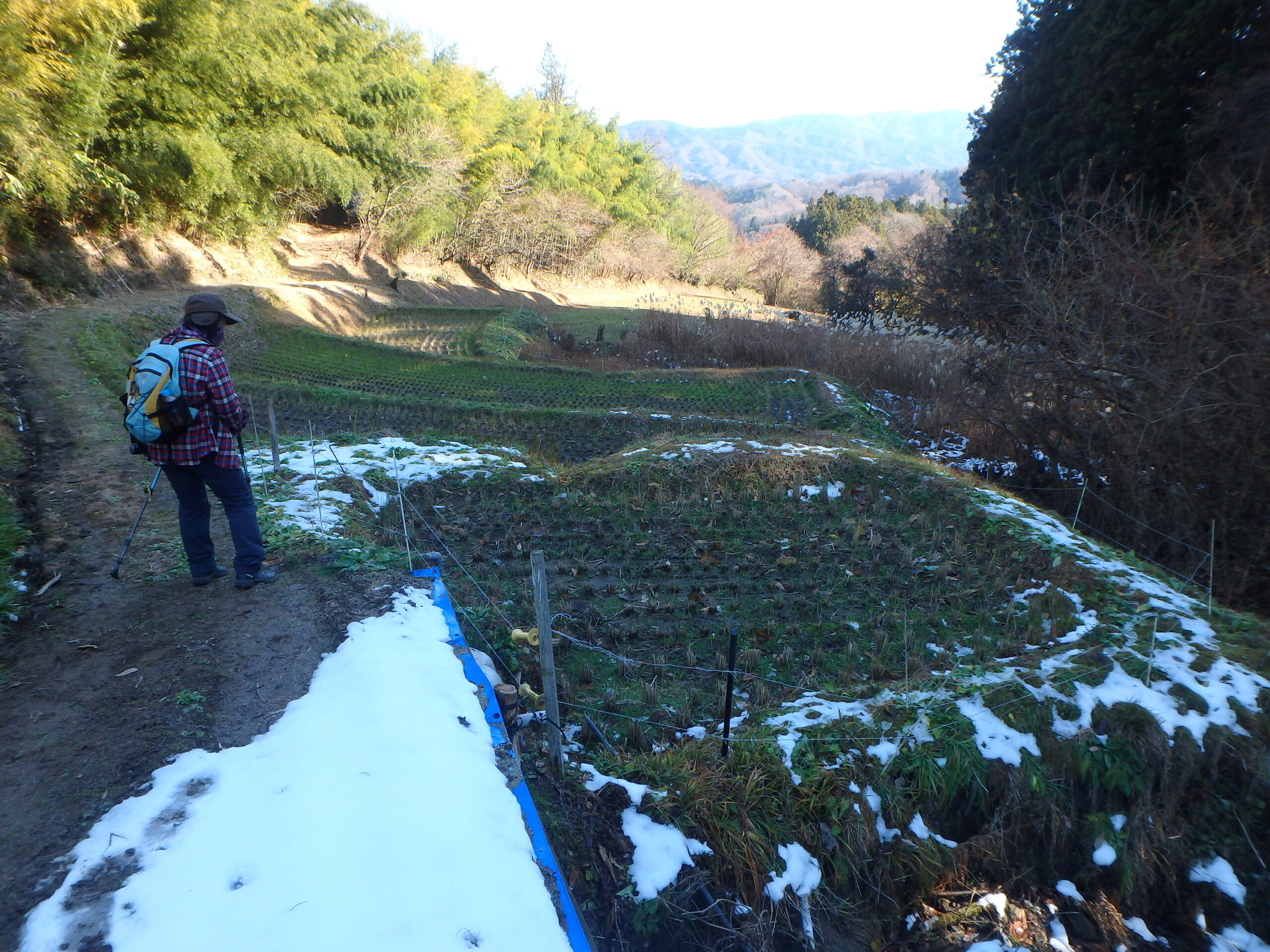 同じ道を下る。陰になって見えづらいが、手前の田は畳三枚くらい。