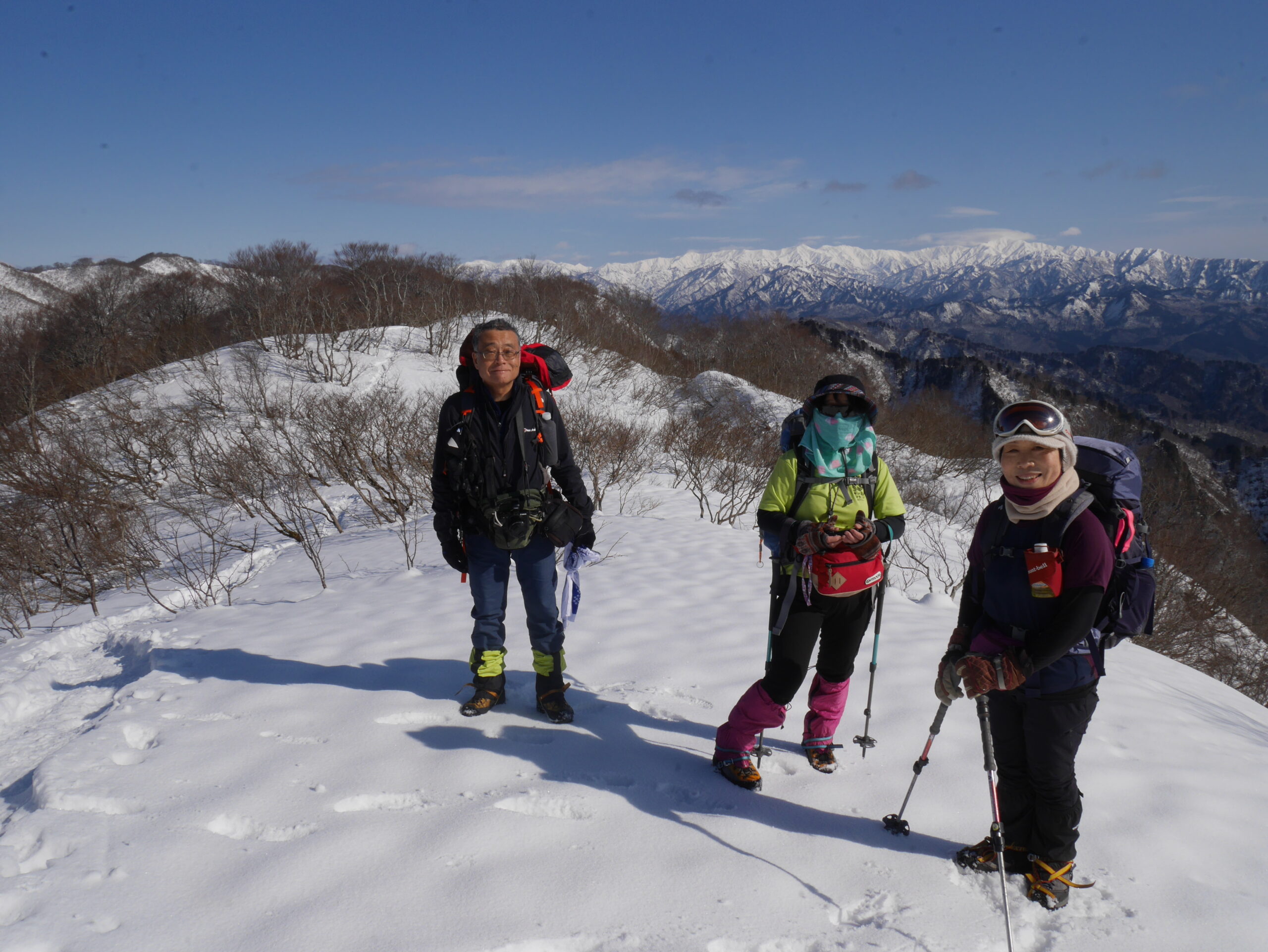 途中で昼食、1時30分、菱へとまた進む。奥のピークが菱。