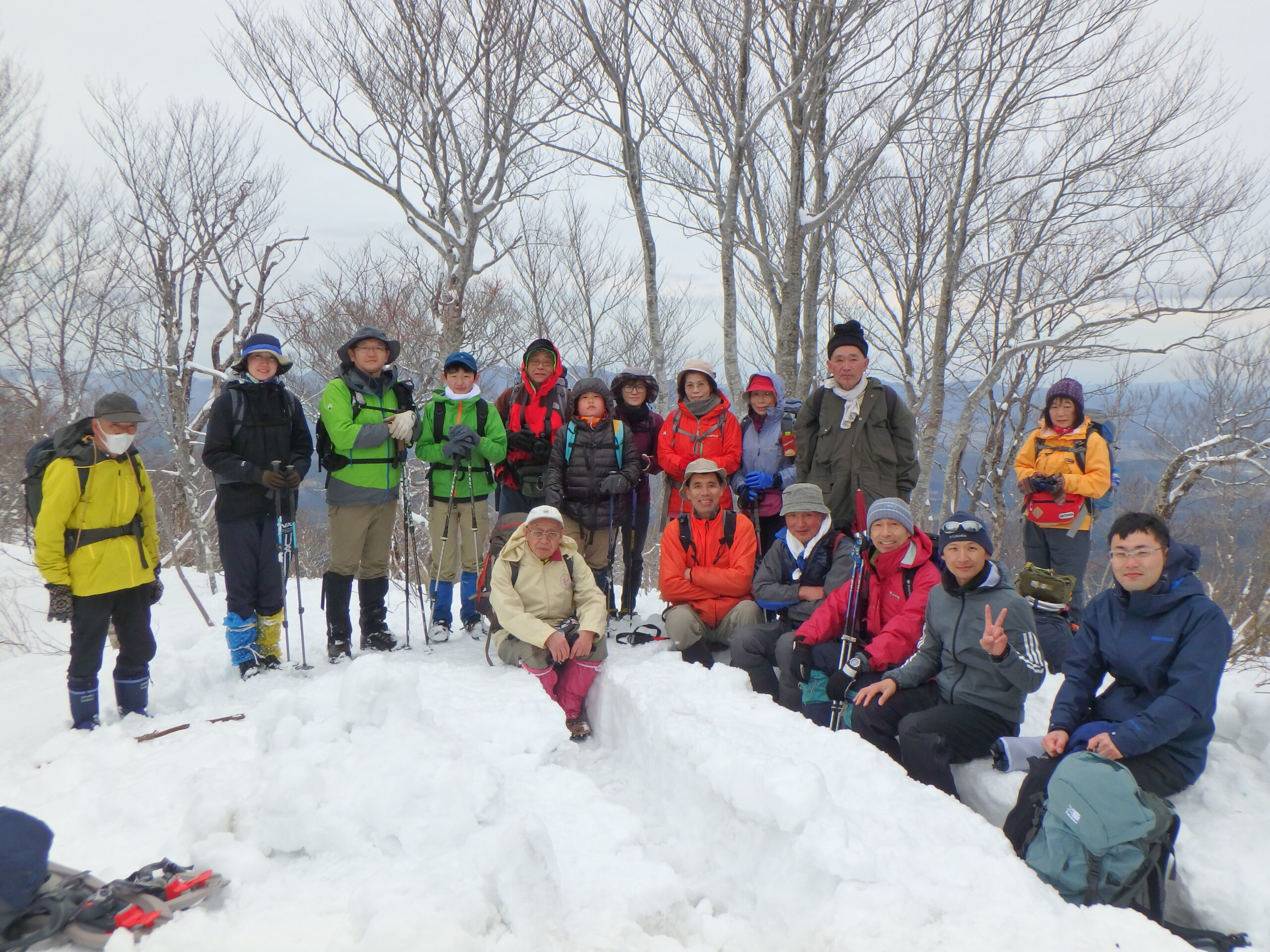 浮世と同様天気もままならない。朝のうちに上がるはずの雨が残ってポツポツと降る中での集合、歩き始めれば小雪さえちらつく様子、着込めば暑い脱げば寒いで登り始めて3時間、なんとか無事に積雪期しか眺望の無い山、葡萄鼻に着いた。