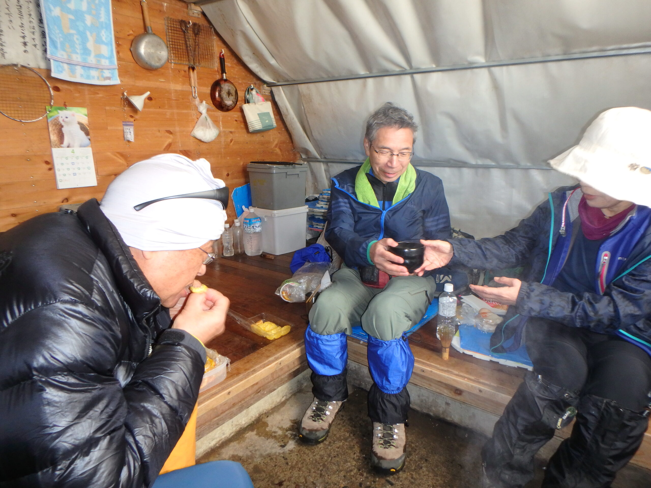 避難小屋で昼食 石山さんが抹茶を立ててくれた。