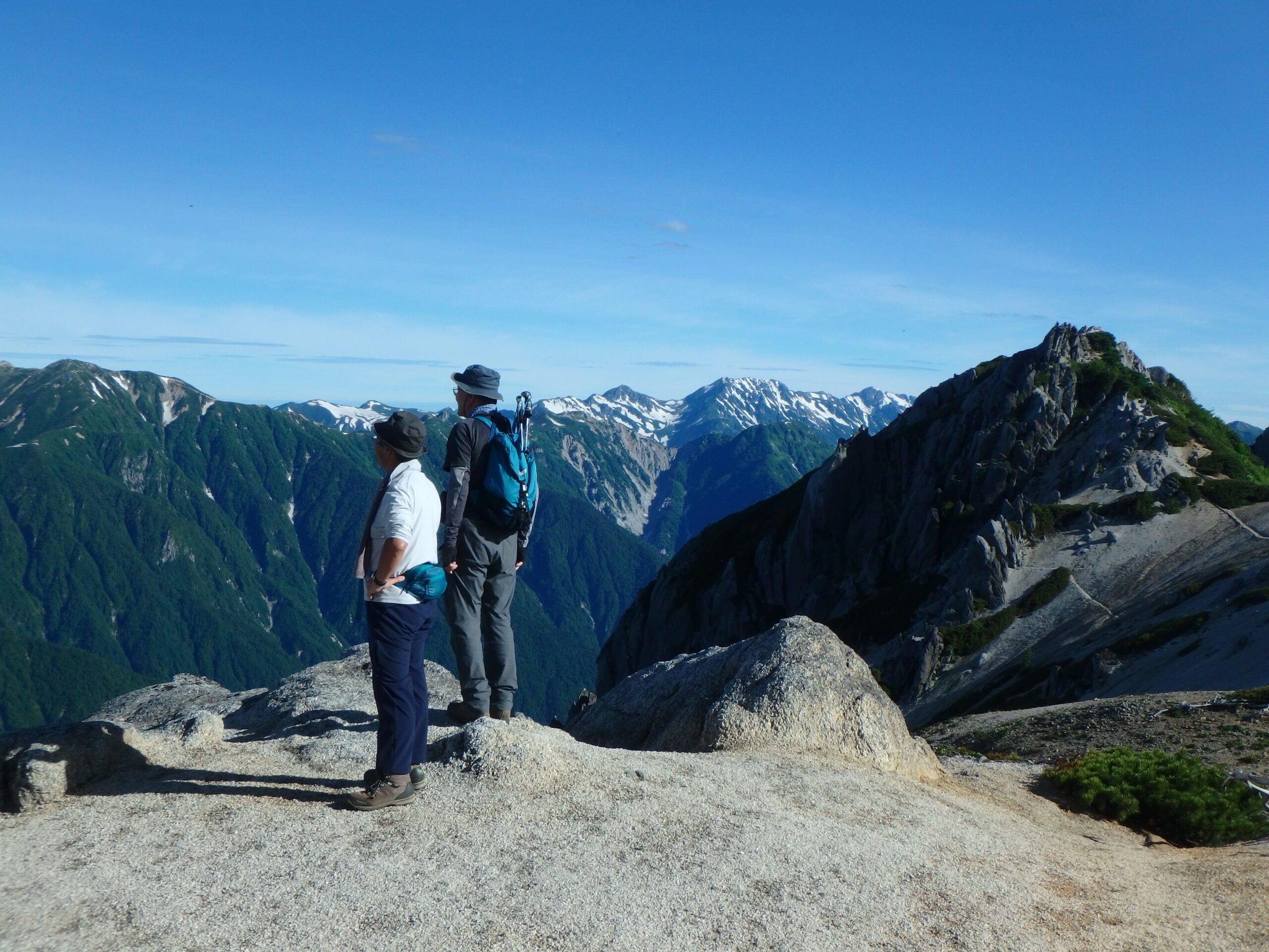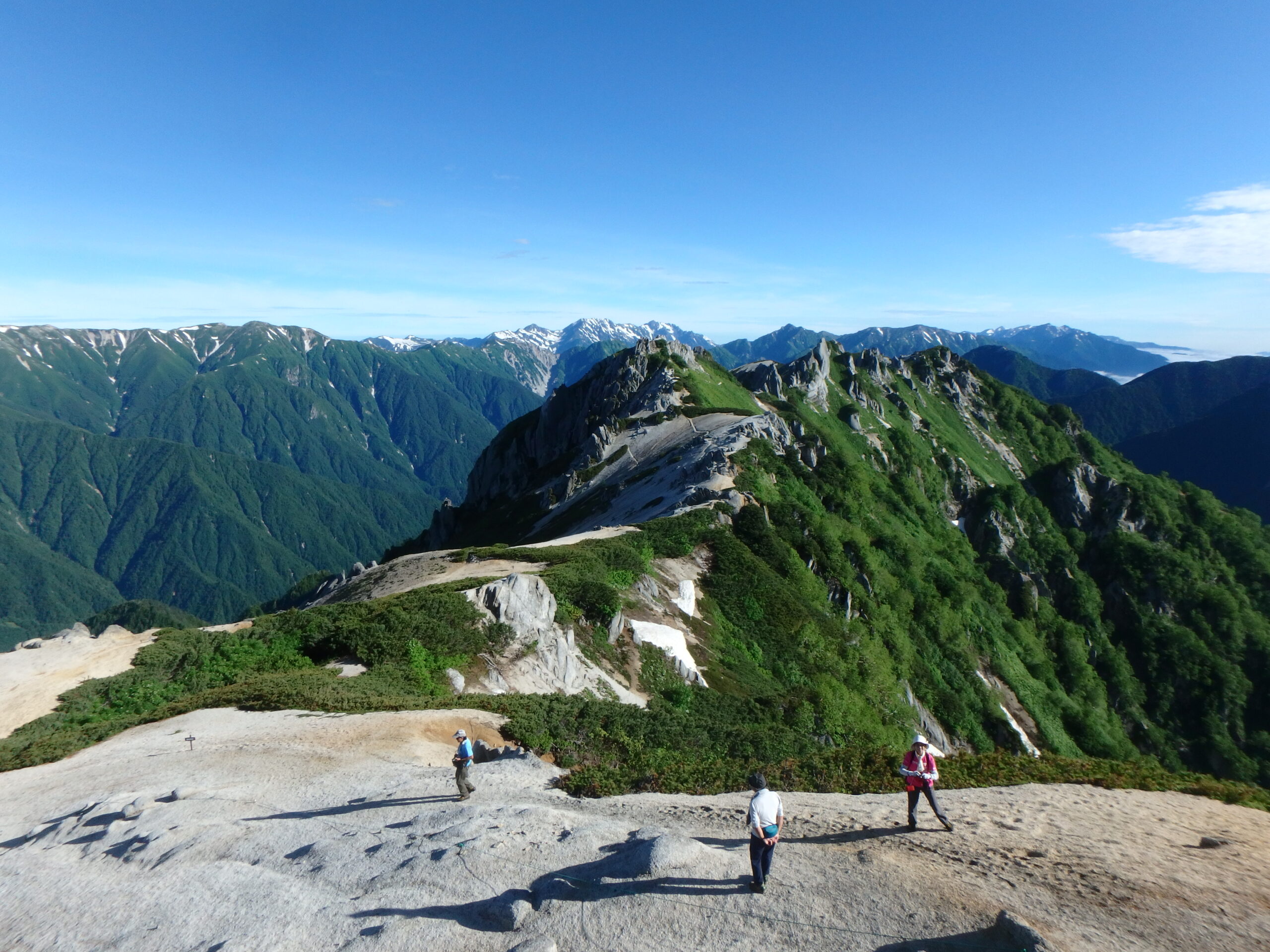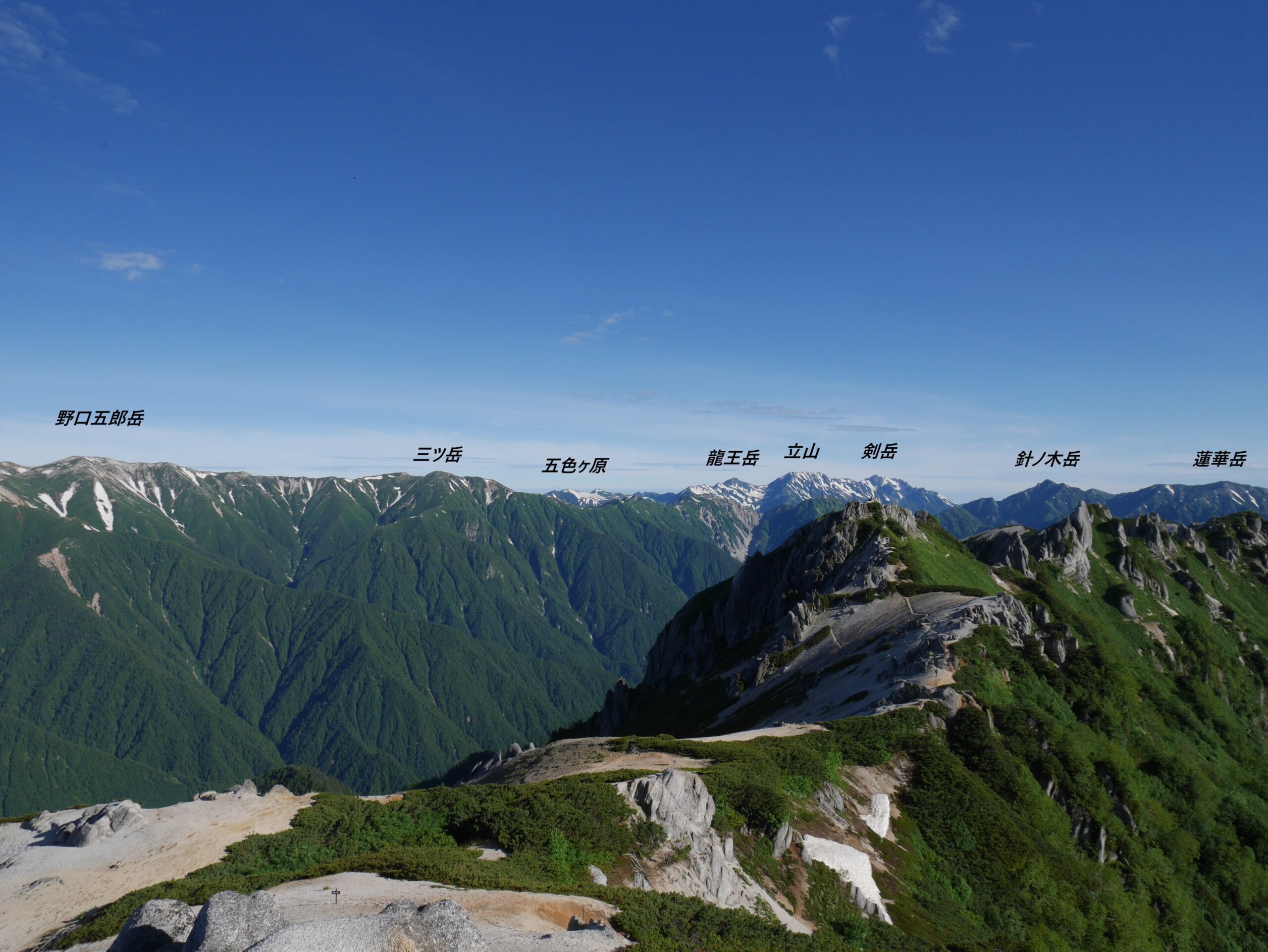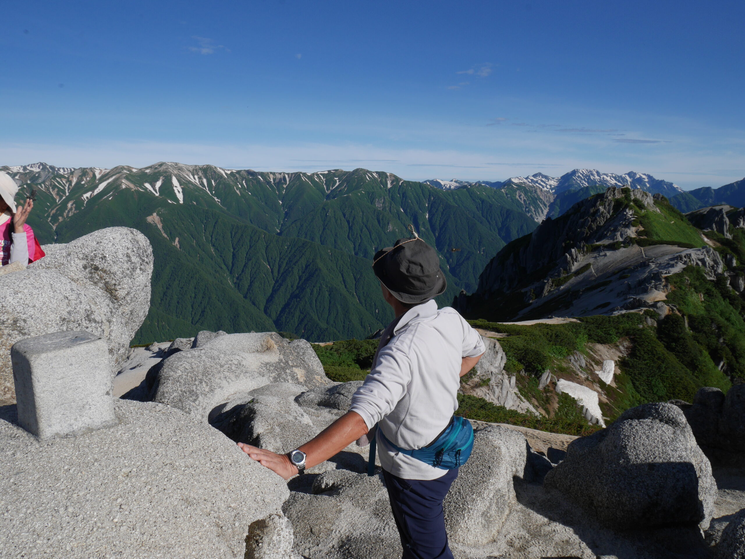 右に北燕岳、そして剱、立山、竜王岳。池田さんの頭の上、白く雪を残すのが五色ヶ原。