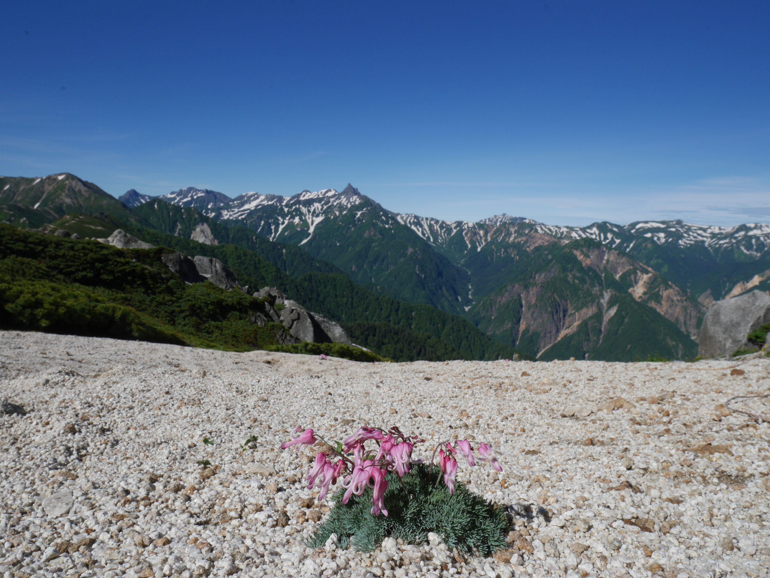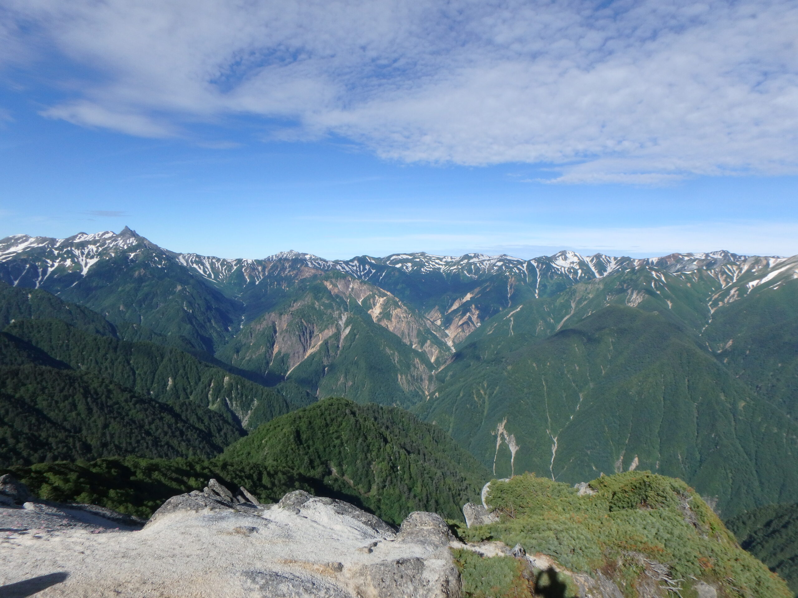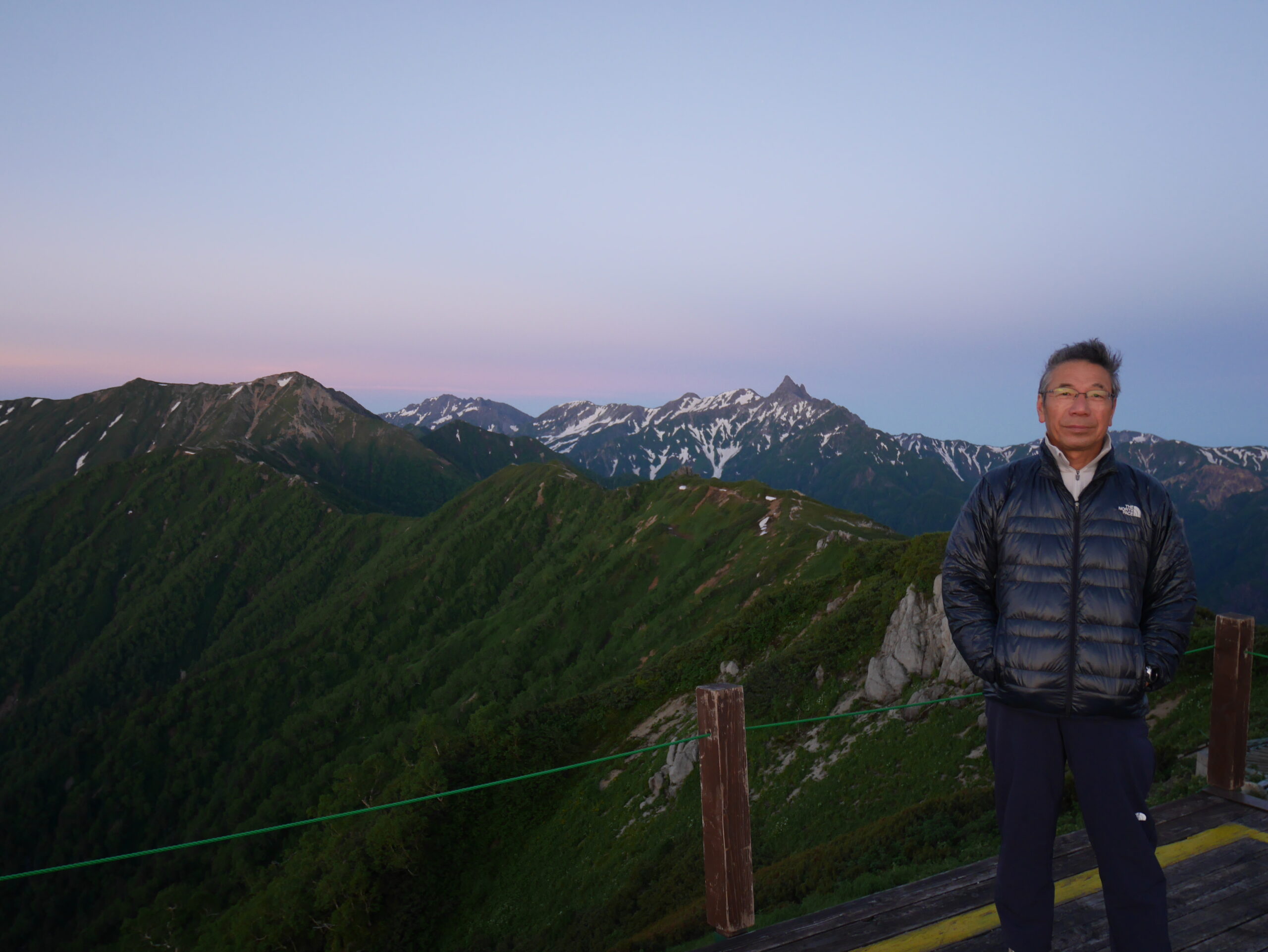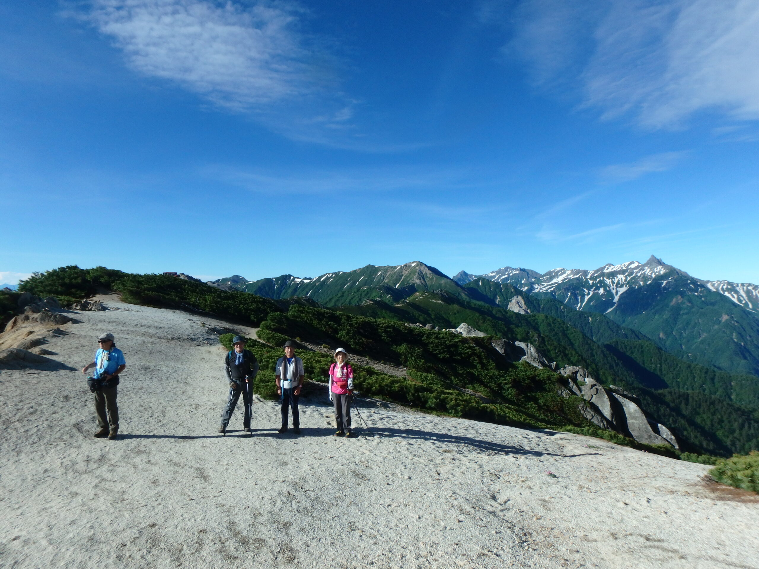 右に北燕岳、そして剱、立山、竜王岳。池田さんの頭の上、白く雪を残すのが五色ヶ原。