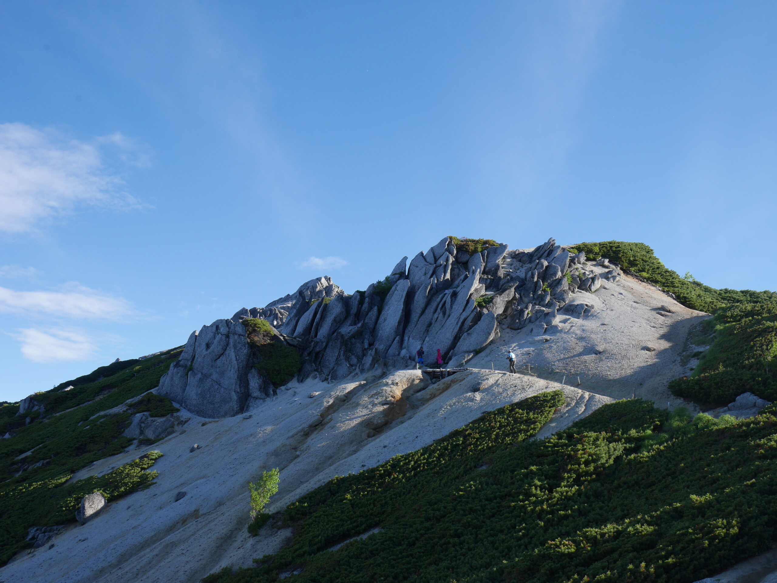 中央の北燕岳へ向かう。北燕岳の右側斜面の草地がお花畑になっていた。