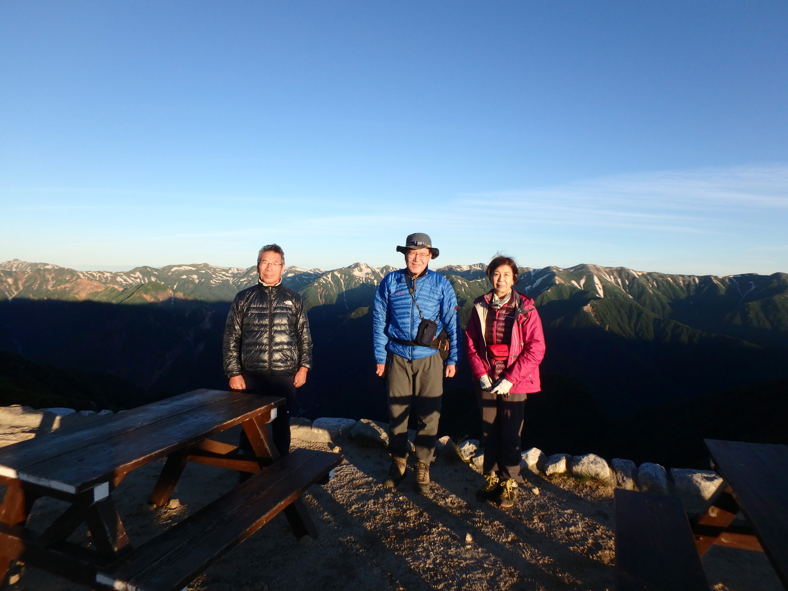 翌日は素晴らしい景色で幕が上がった。燕岳の左奥に立山と竜王。