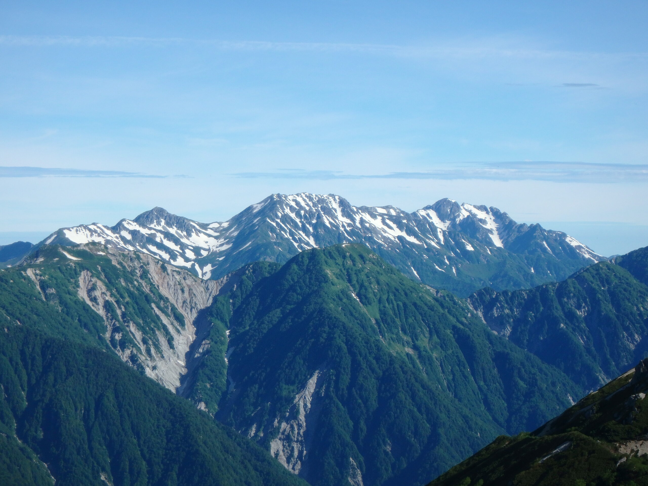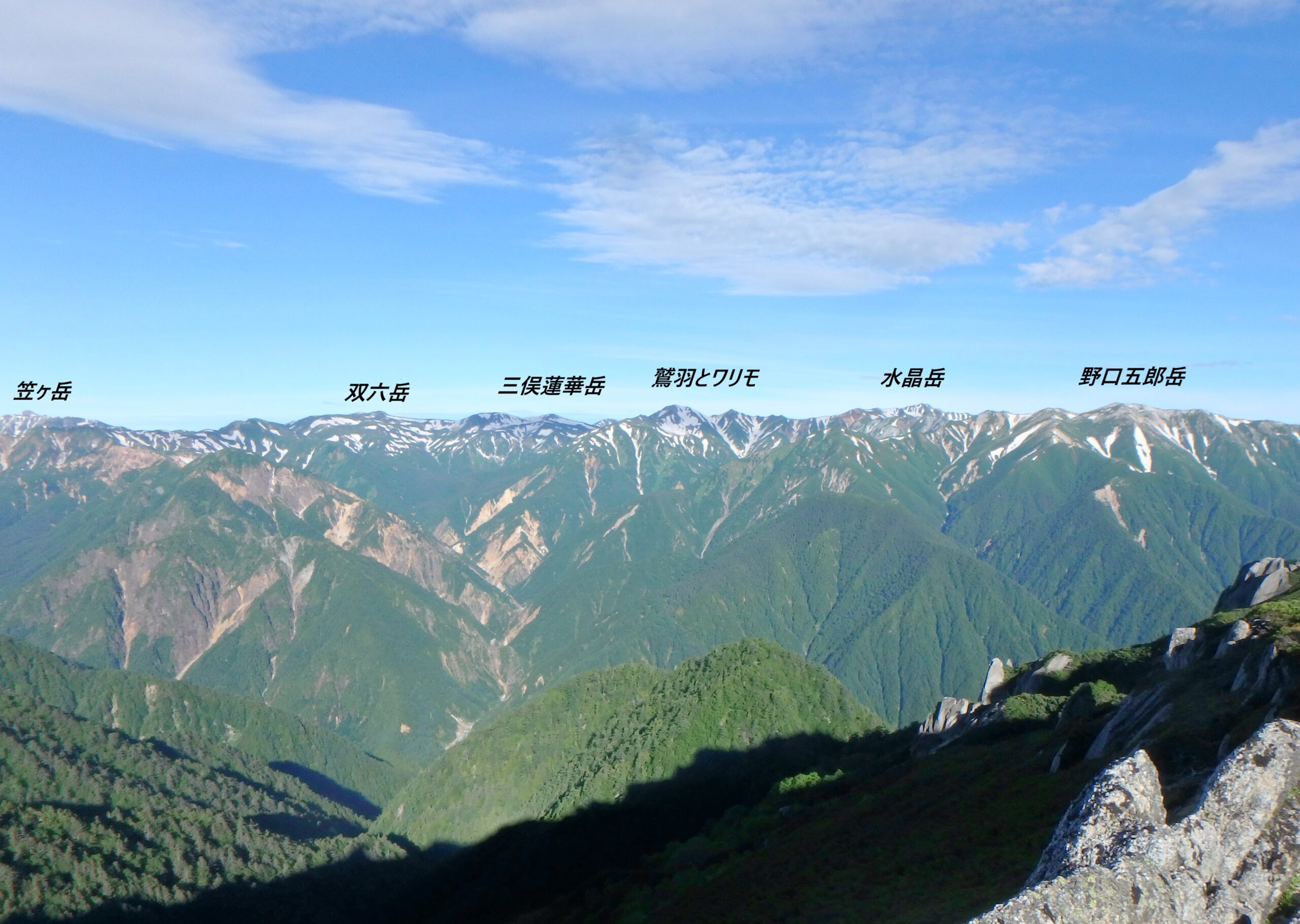 左から槍、笠ヶ岳、双六、三俣蓮華、鷲羽、ワリモ、水晶