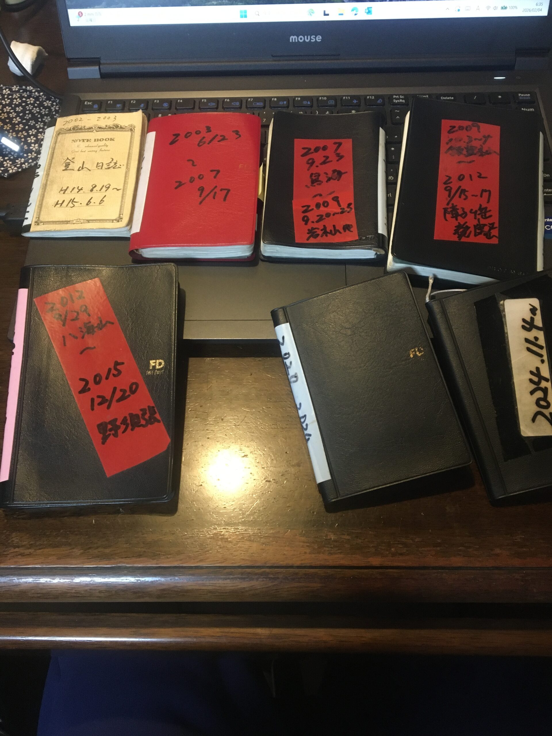 登山を再開した2002年からつけている山手帳。最初は山に持っていったが、今は帰ってきてから写真を見てつけるようになった。2016年から2020年の一冊を紛失した。