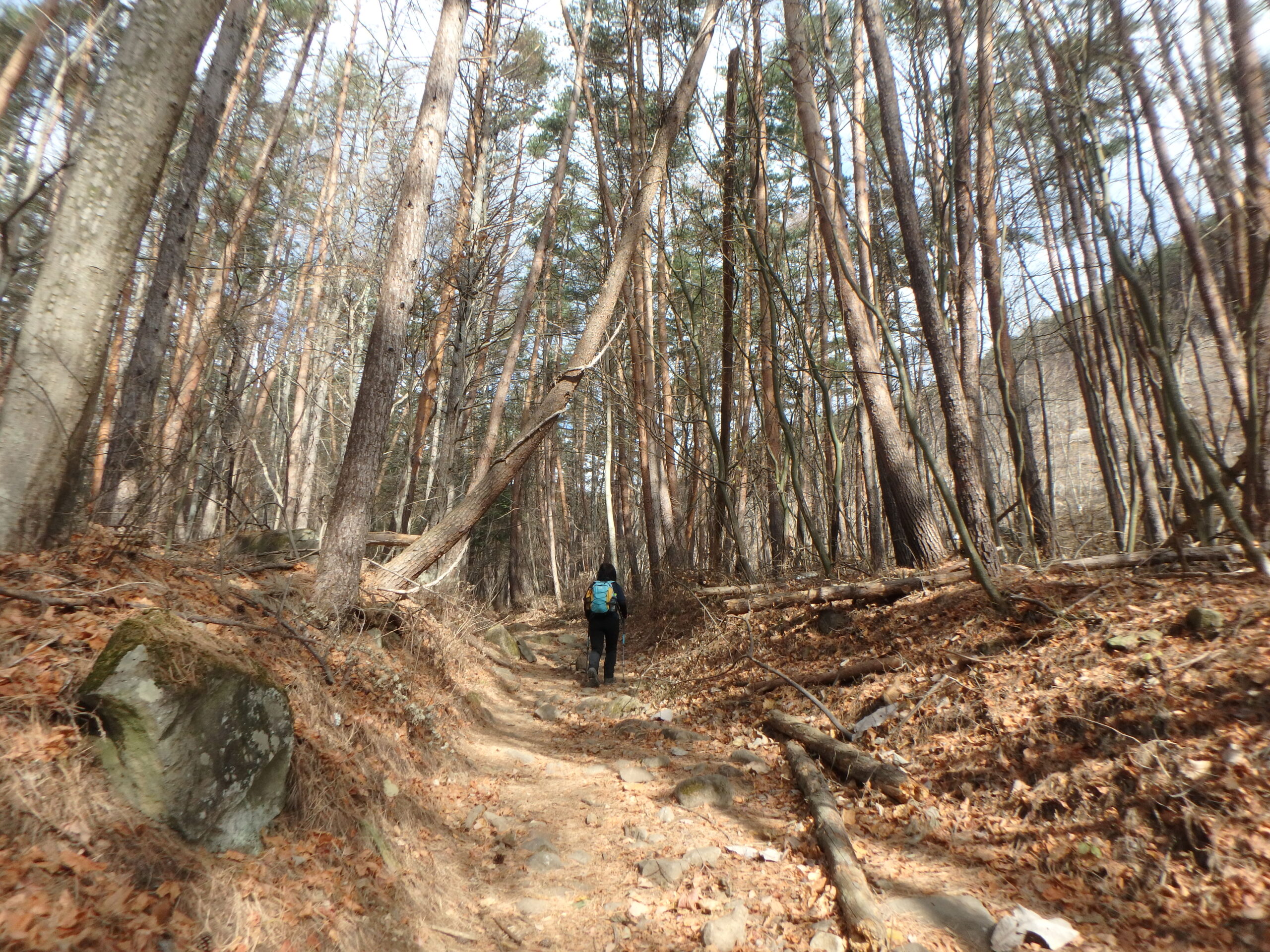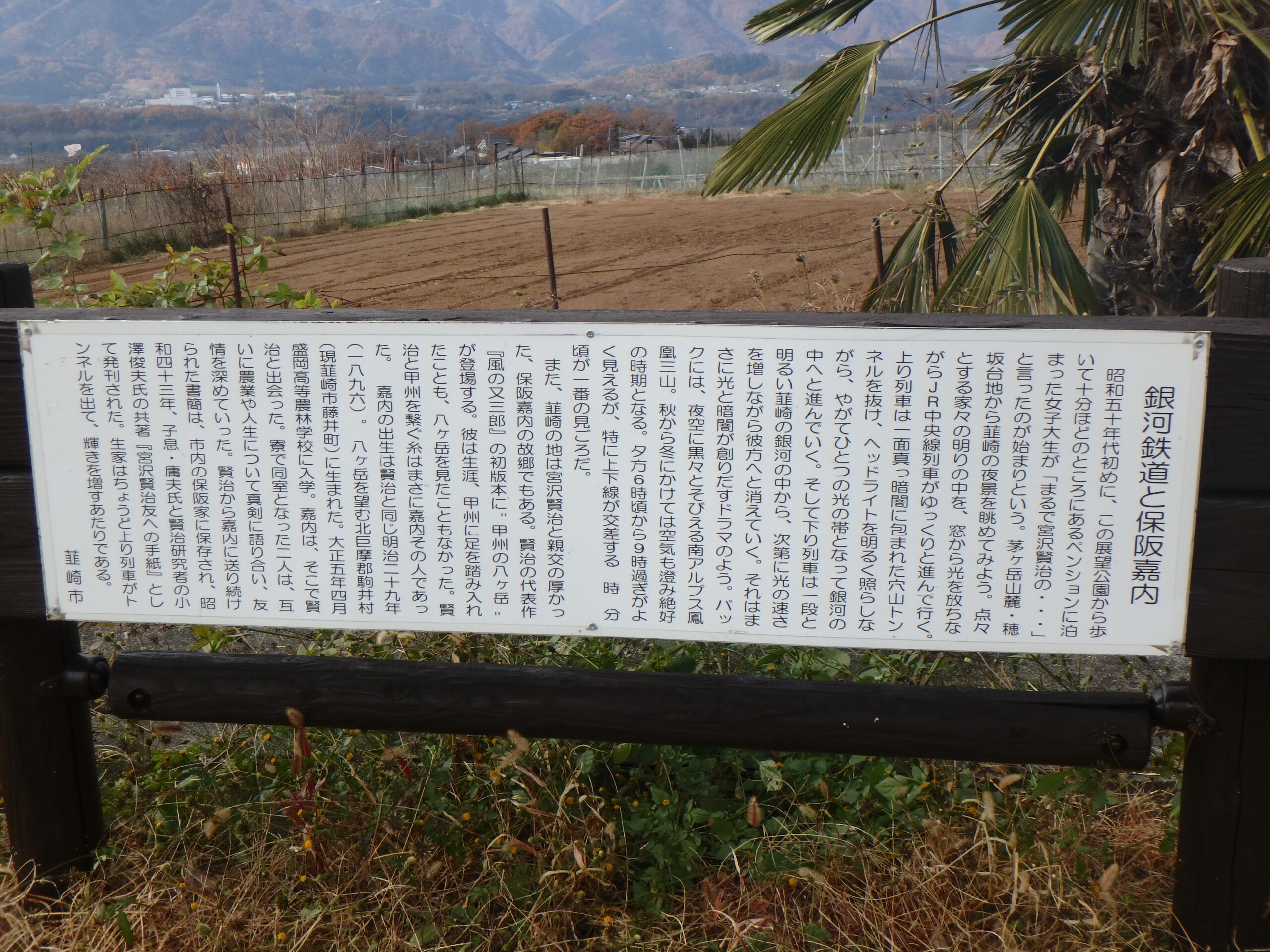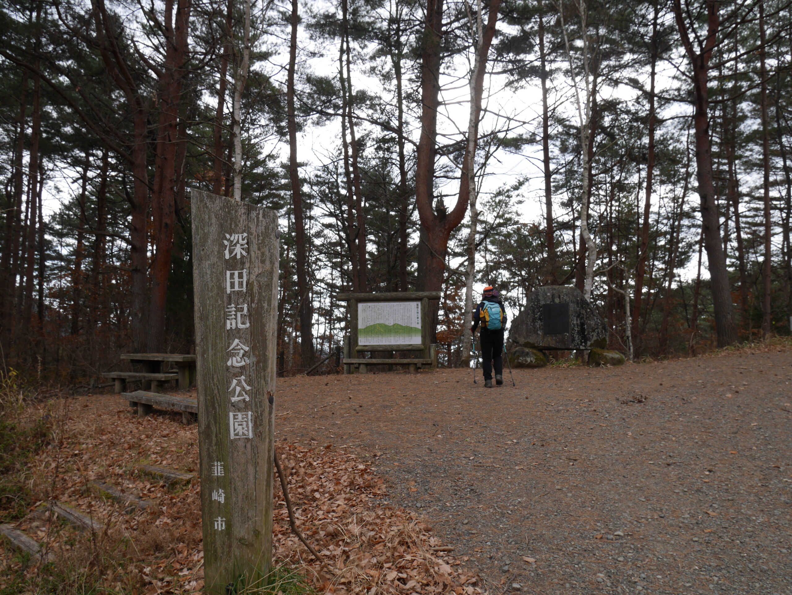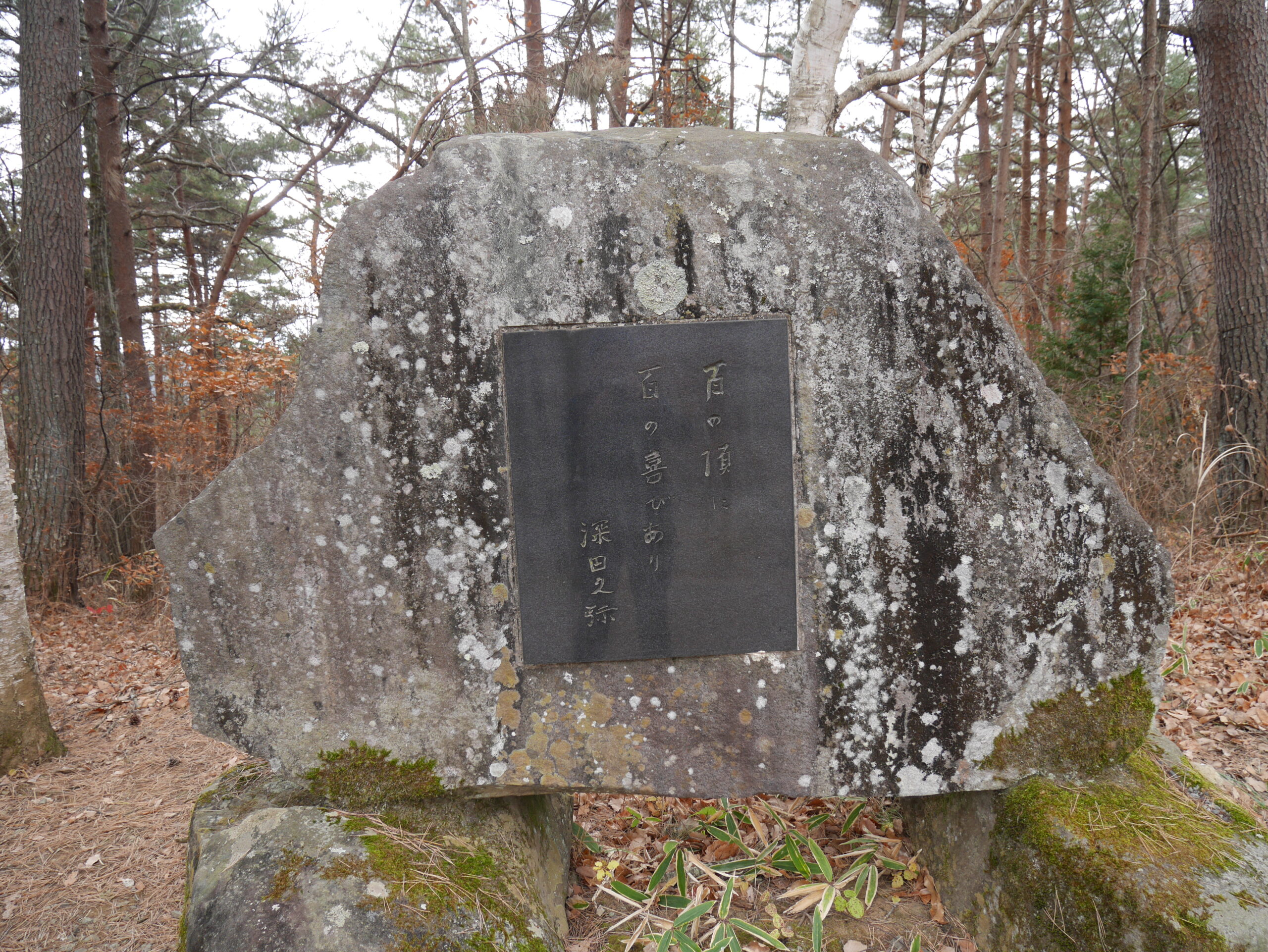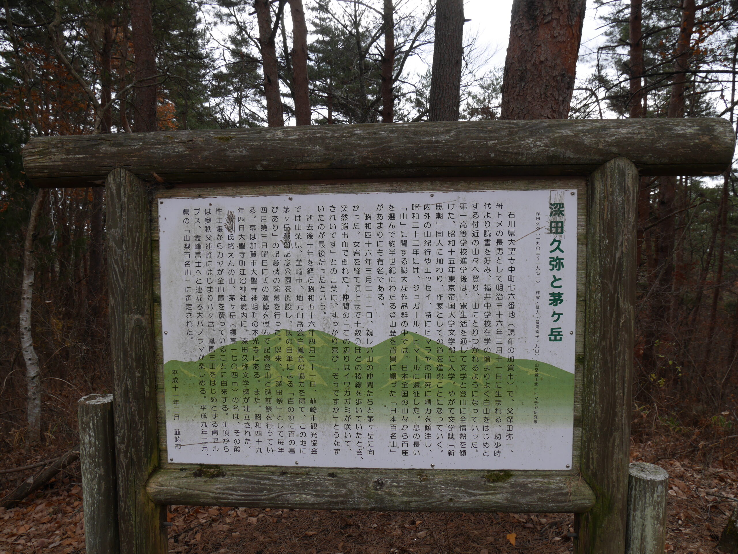 深田記念公園が登山口であったが、思い掛けなく小さな公園であった。有名な「百の頂に百の喜びあり」という碑はあったが、それだけと言っていいほどで、斜面に作られた東屋は腐朽し、その下に続く公園らしきわずかな敷地は、置かれたベンチも伸び放題の茅に隠れていた。長く続く百名山ブームとこの有様のギャップを寂しく感じながら登山道に進んだ。11:47深田久弥記念公園≫13:55茅ヶ岳山頂14:40≫16:15下山