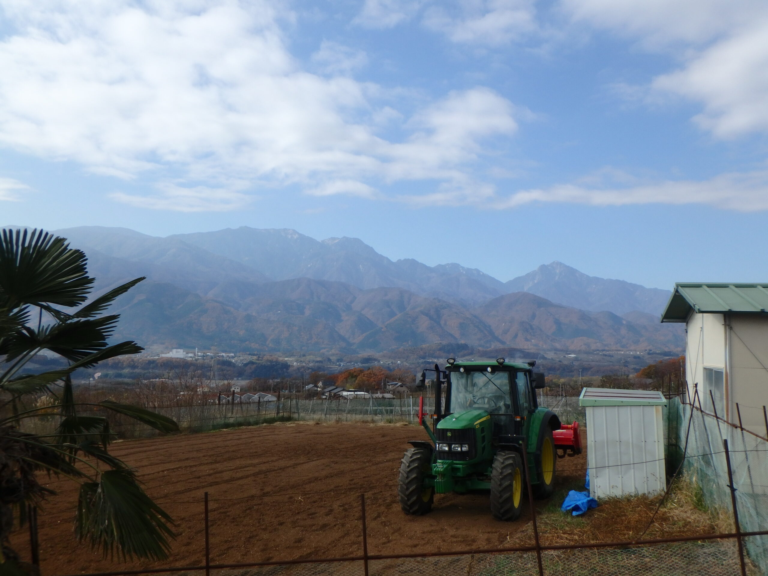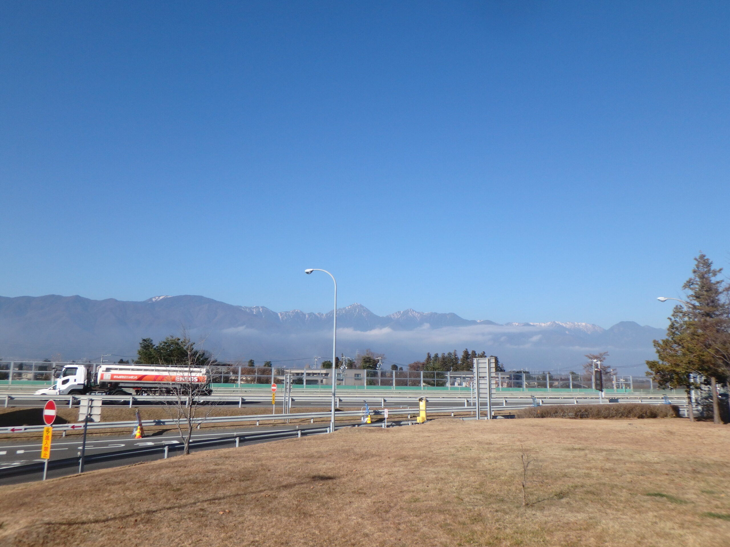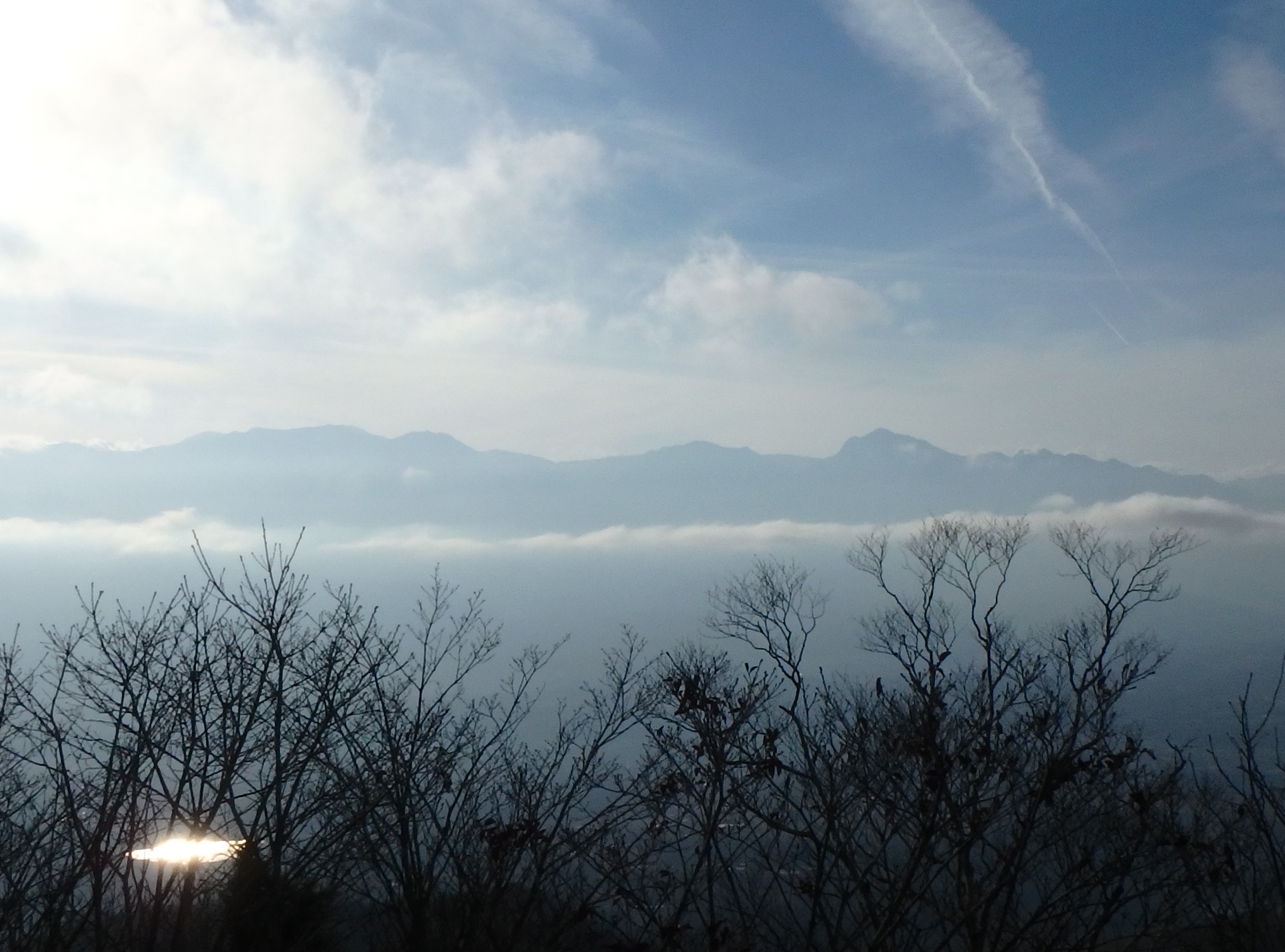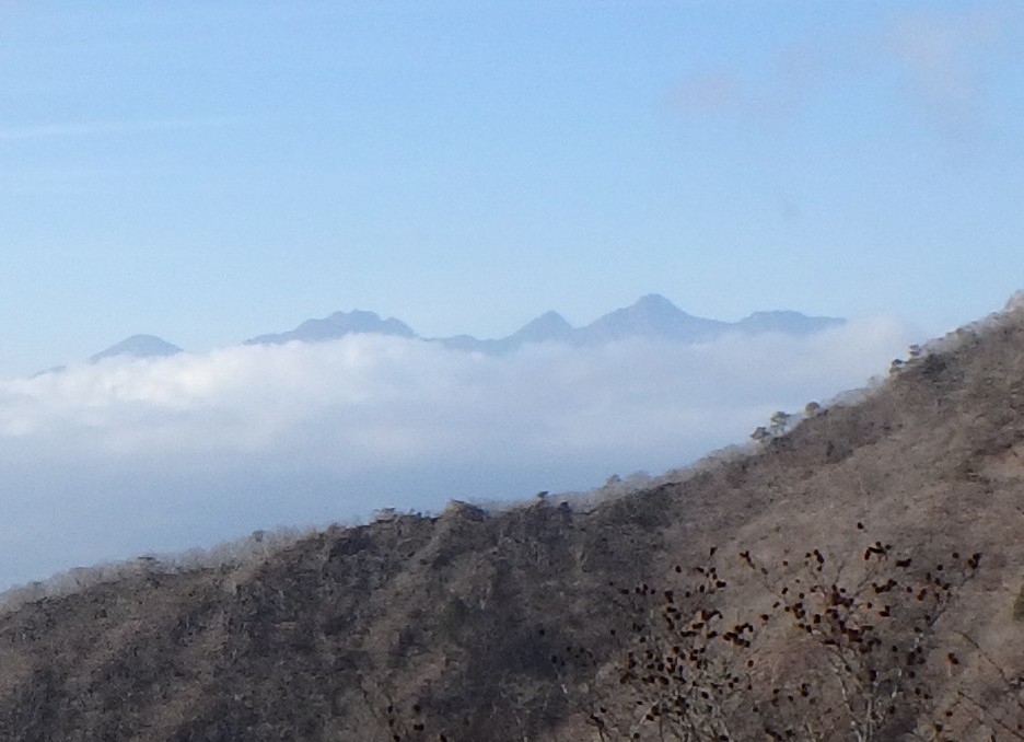 右が甲斐駒、中央にオベリスクのような尖がりが見えるから鳳凰三山か。