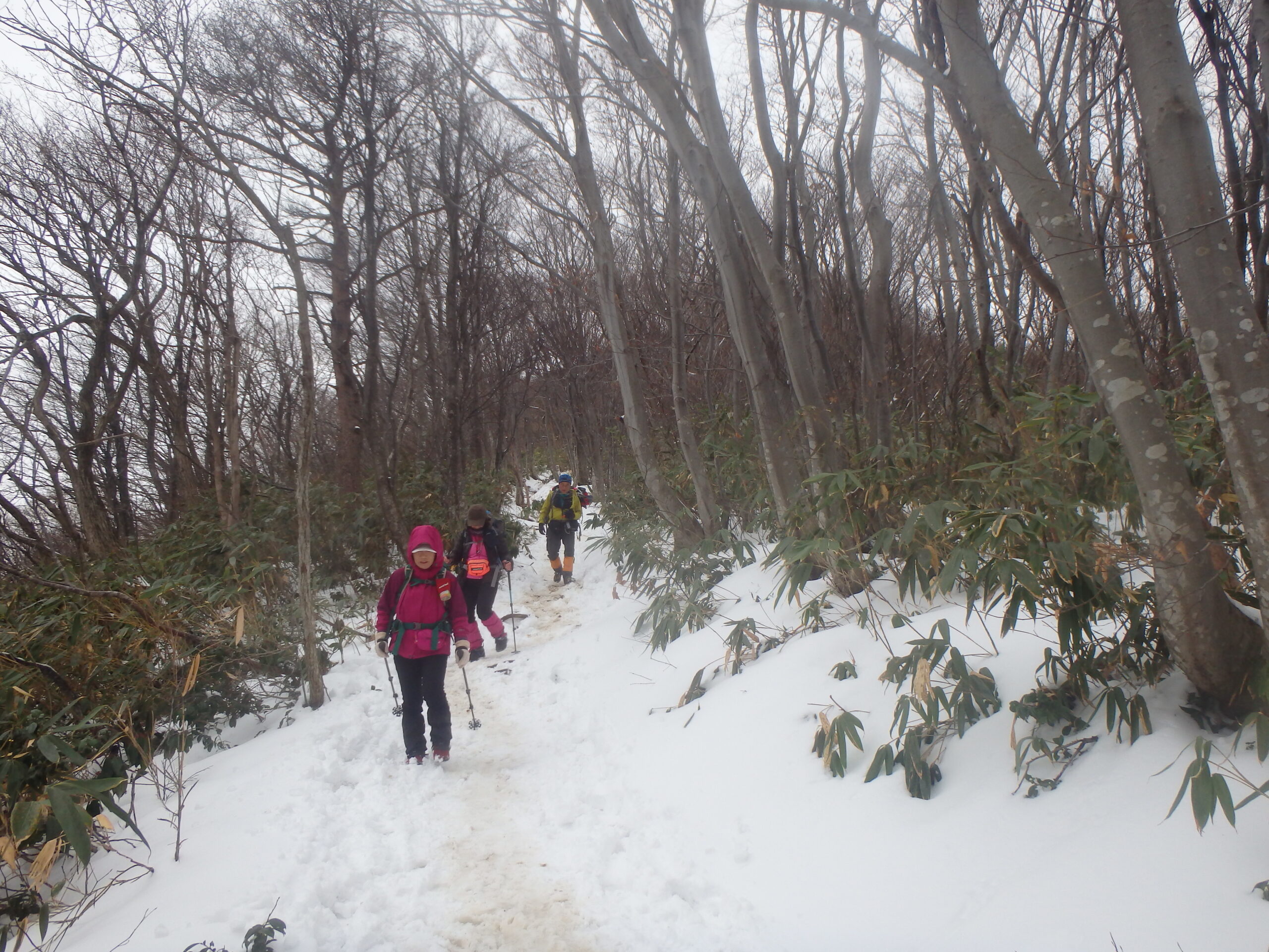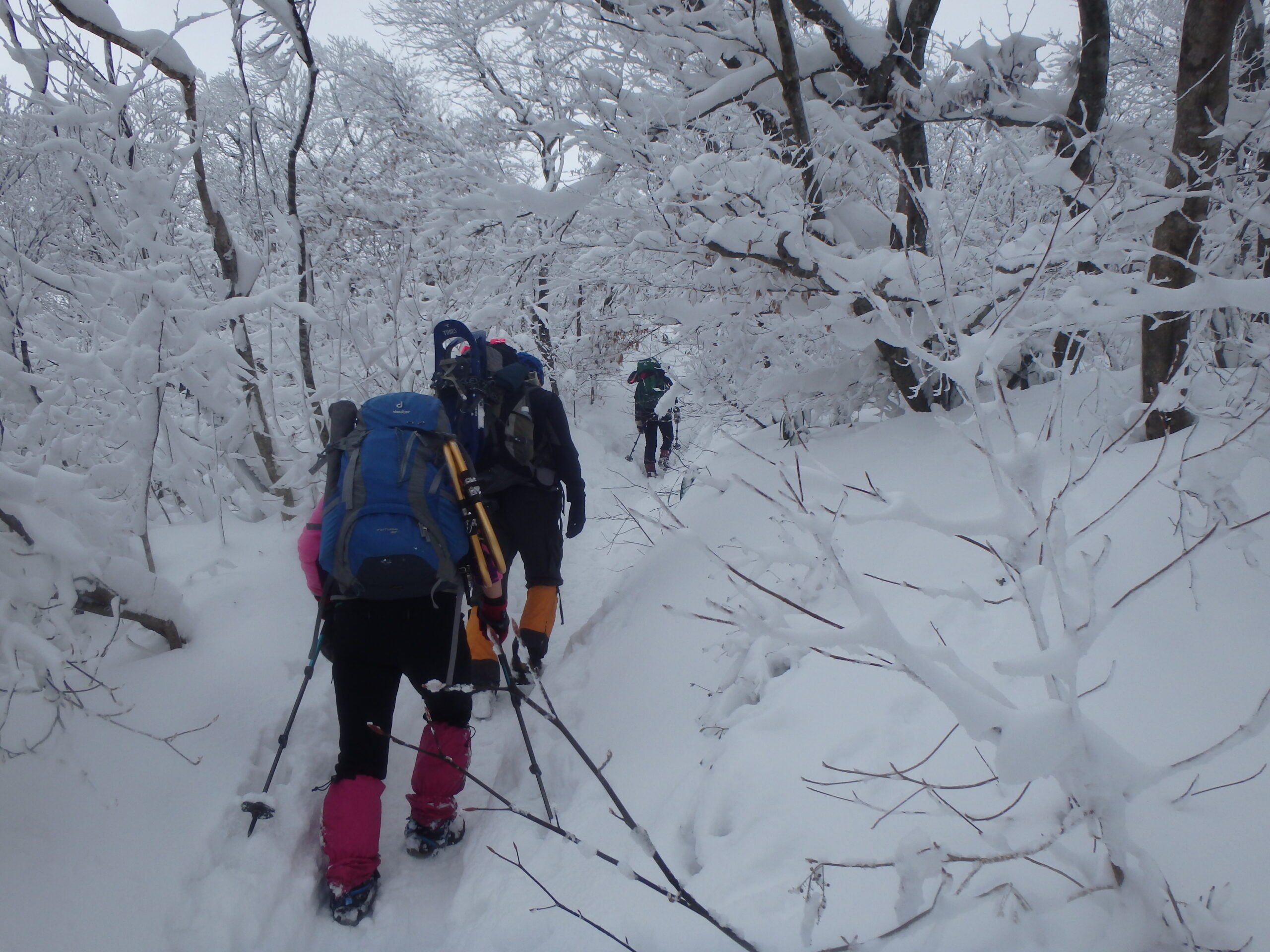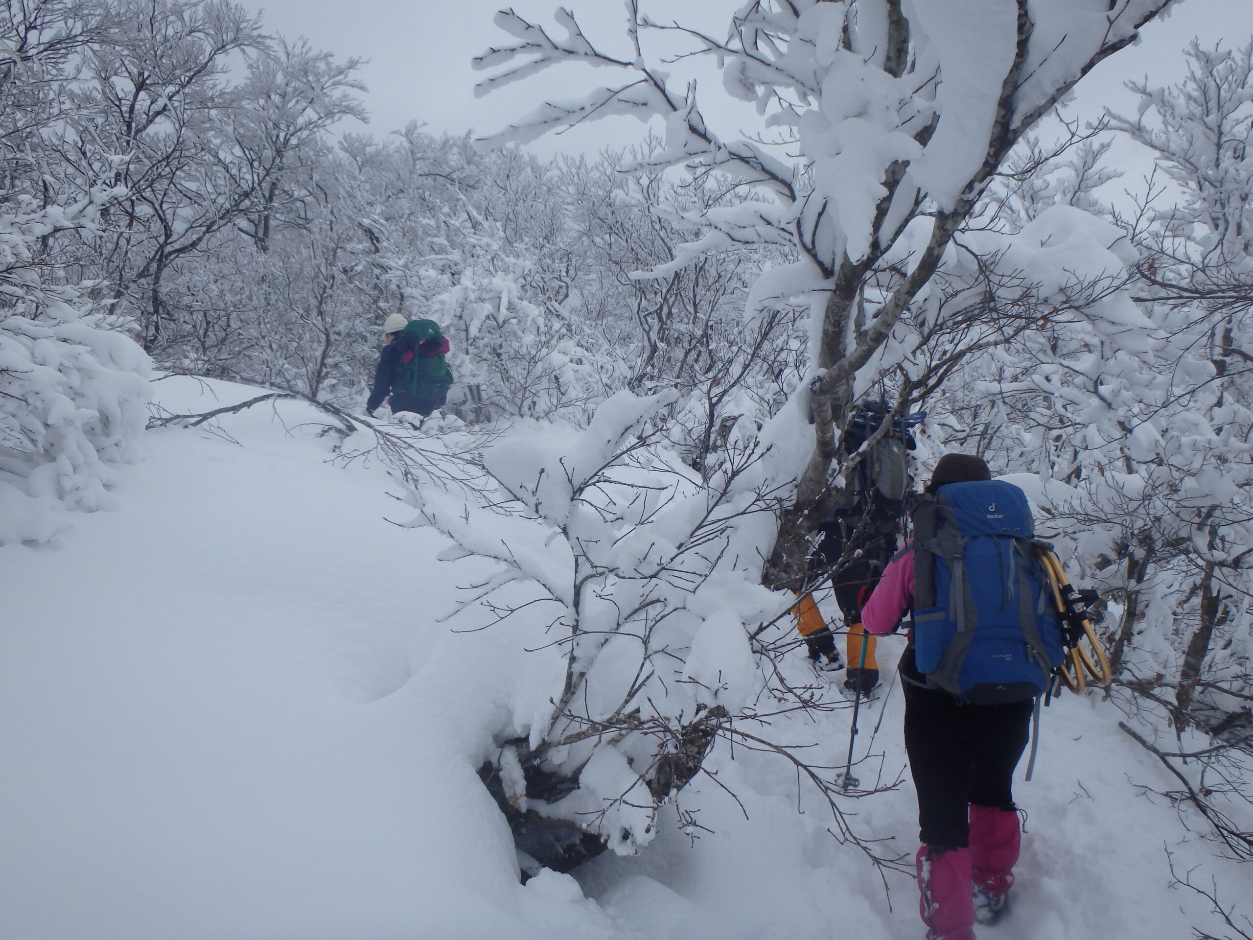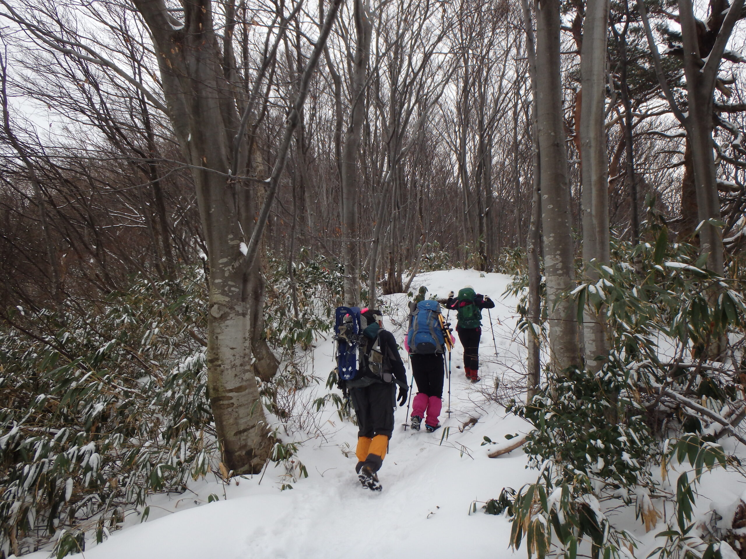初登りの定番、五頭山。ただ今年は例年にない少雪で、一番奥の駐車場まで車が入れた。冬場にそこまで入れたのは初めてで、これ以降も無い。当然山にも雪は少なく、藪の上を歩く登行が藪の中になる場所も多かった。7:31奥の駐車場≫7:48三ノ峰登山口≫9:39三ノ峰≫10:07一ノ峰≫10:38三角点≫11:17二ノ峰(テントを張って昼食)≫13:14≫14:37三ノ峰登山口≫14:43駐車場