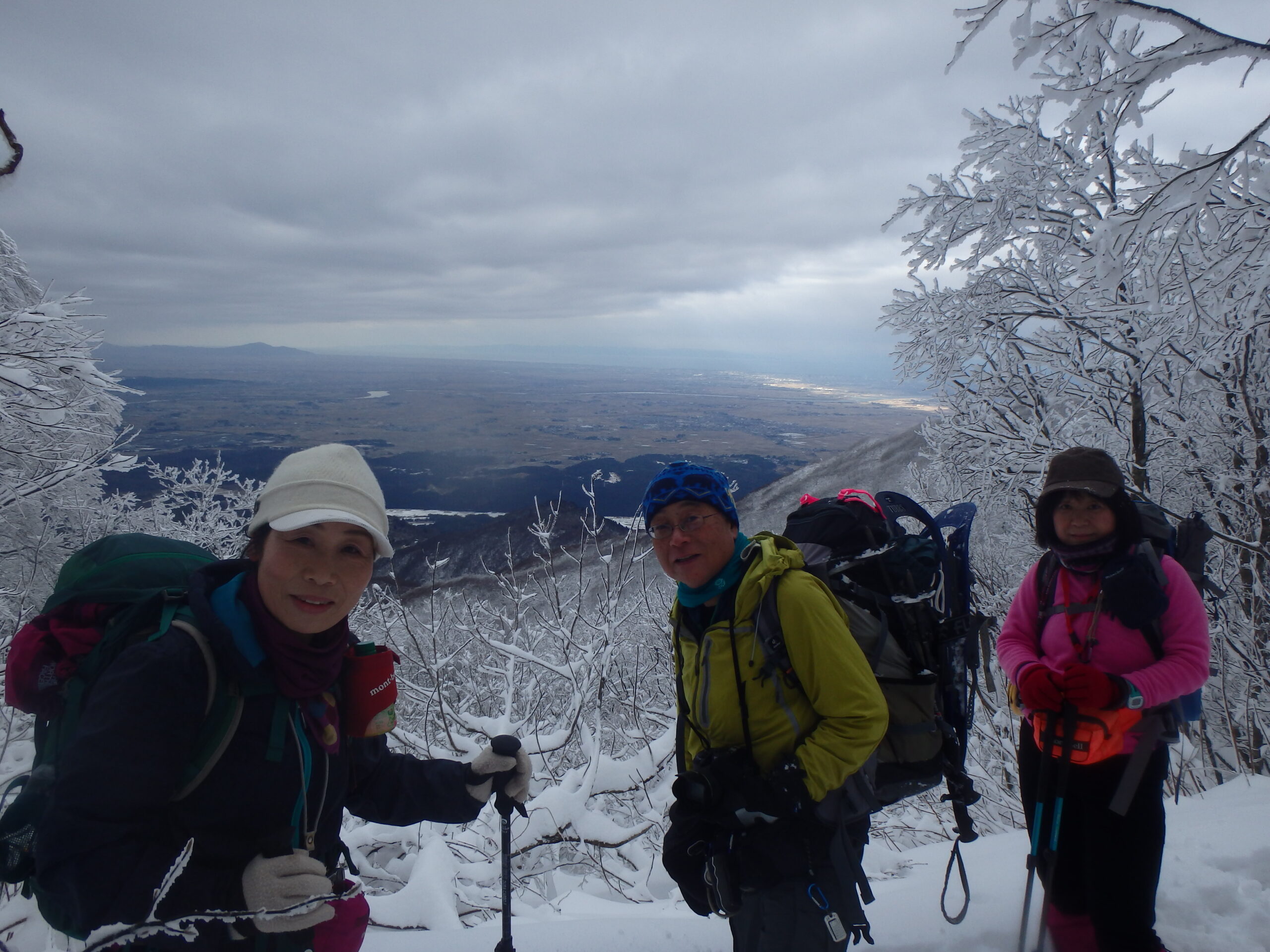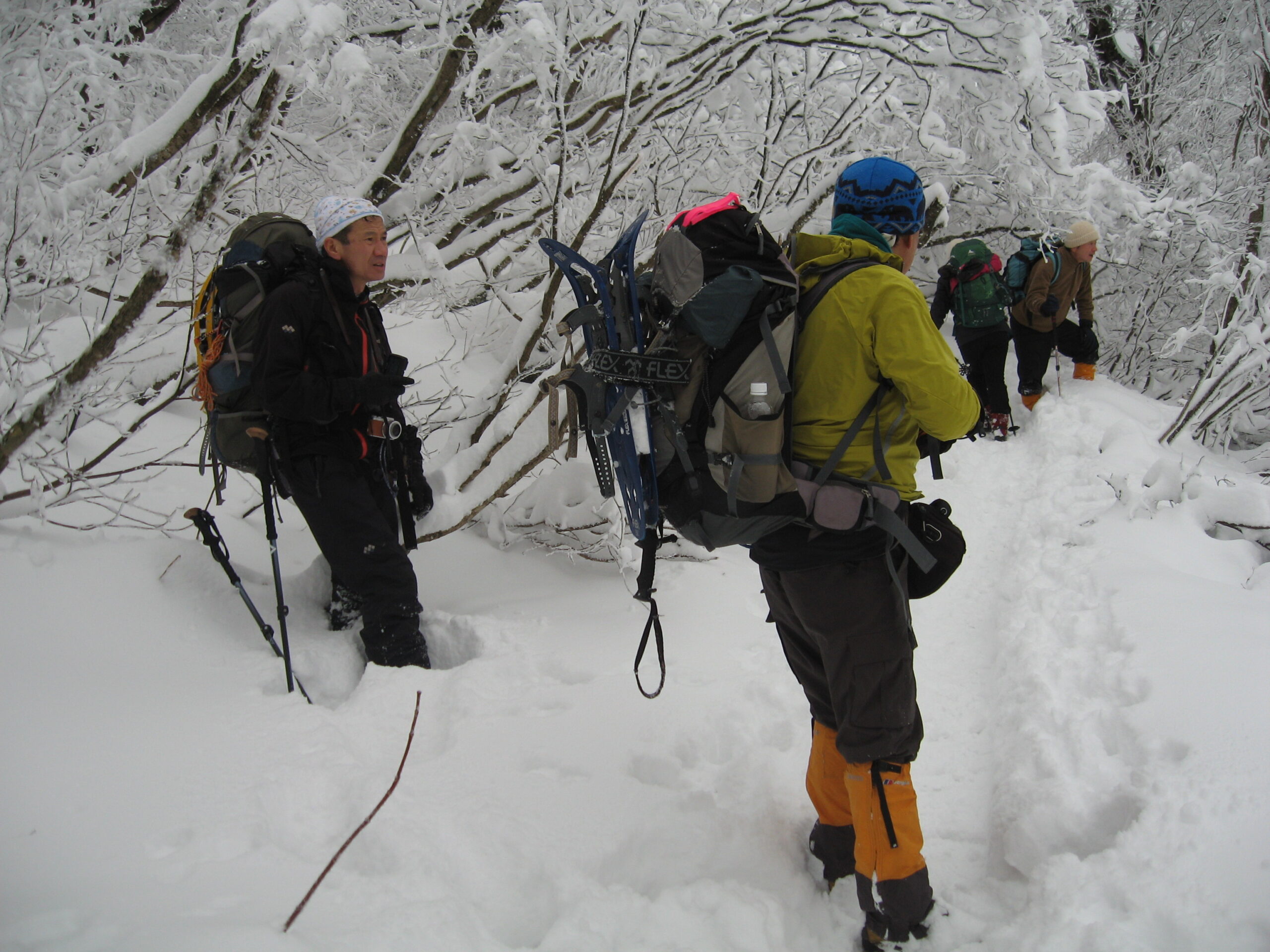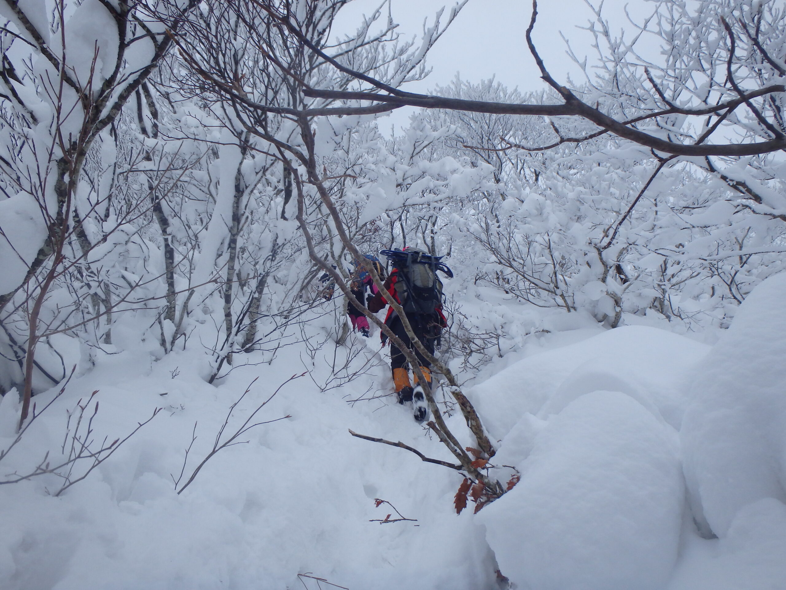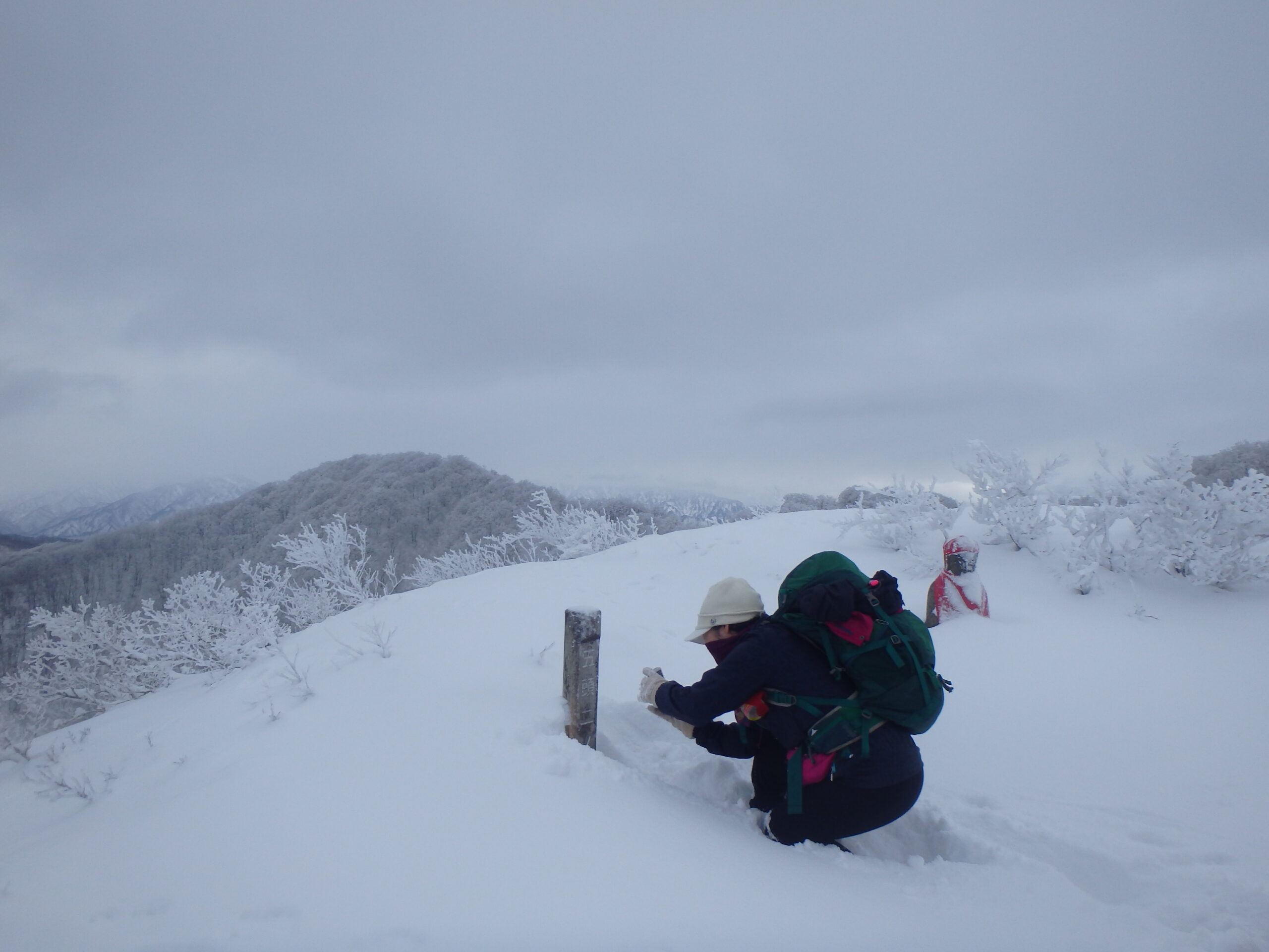 初登りの定番、五頭山。ただ今年は例年にない少雪で、一番奥の駐車場まで車が入れた。冬場にそこまで入れたのは初めてで、これ以降も無い。当然山にも雪は少なく、藪の上を歩く登行が藪の中になる場所も多かった。7:31奥の駐車場≫7:48三ノ峰登山口≫9:39三ノ峰≫10:07一ノ峰≫10:38三角点≫11:17二ノ峰(テントを張って昼食)≫13:14≫14:37三ノ峰登山口≫14:43駐車場