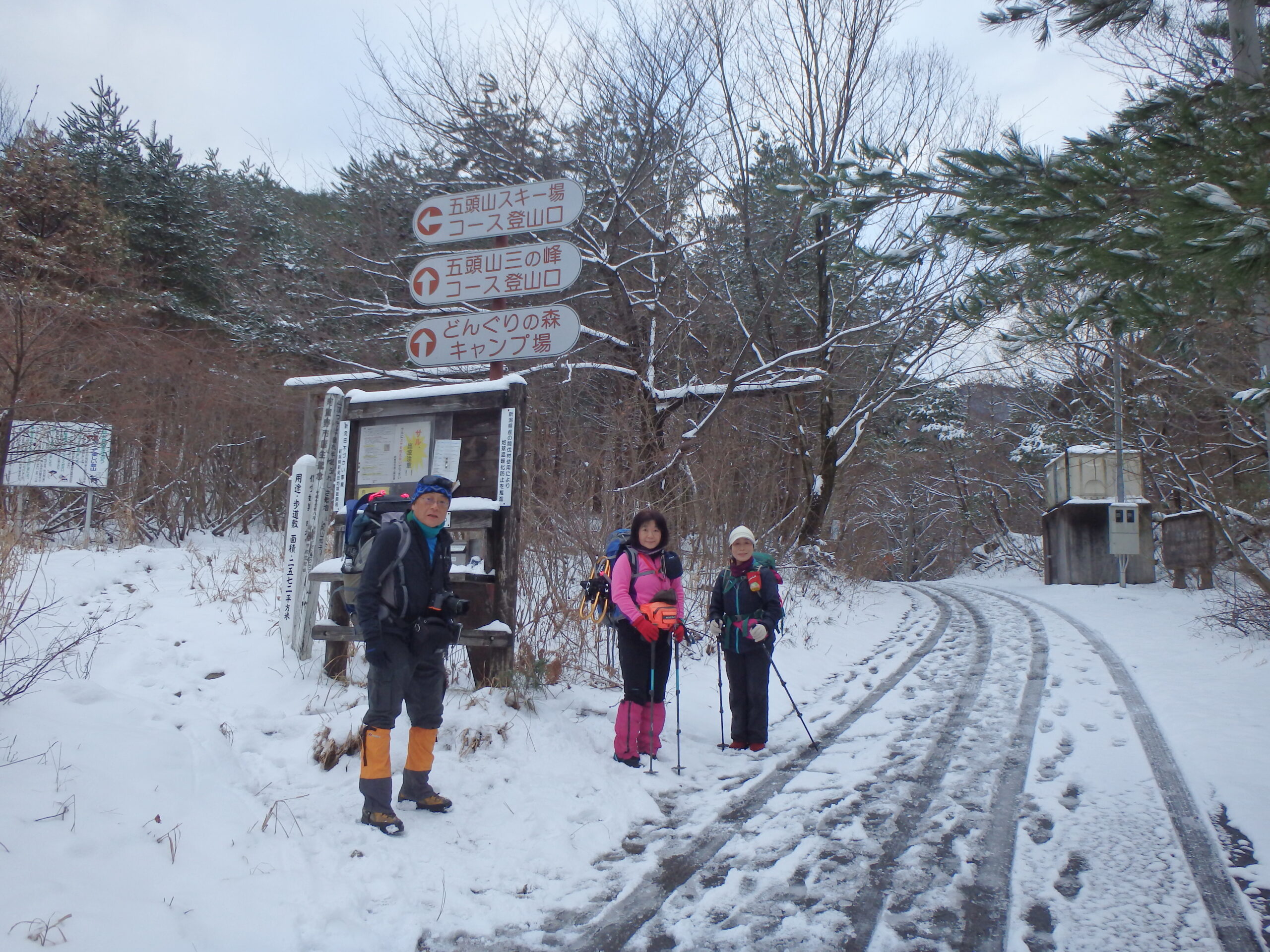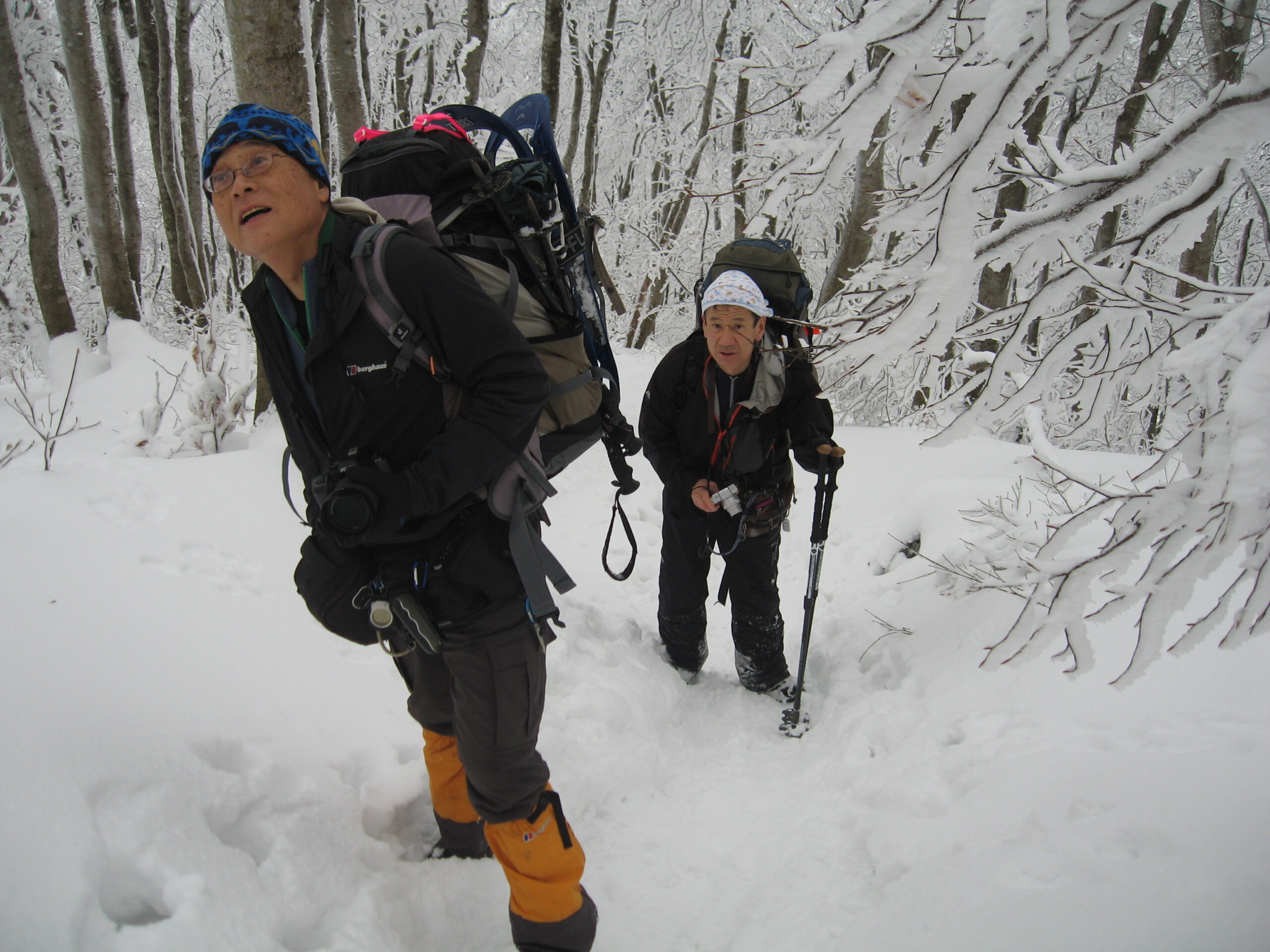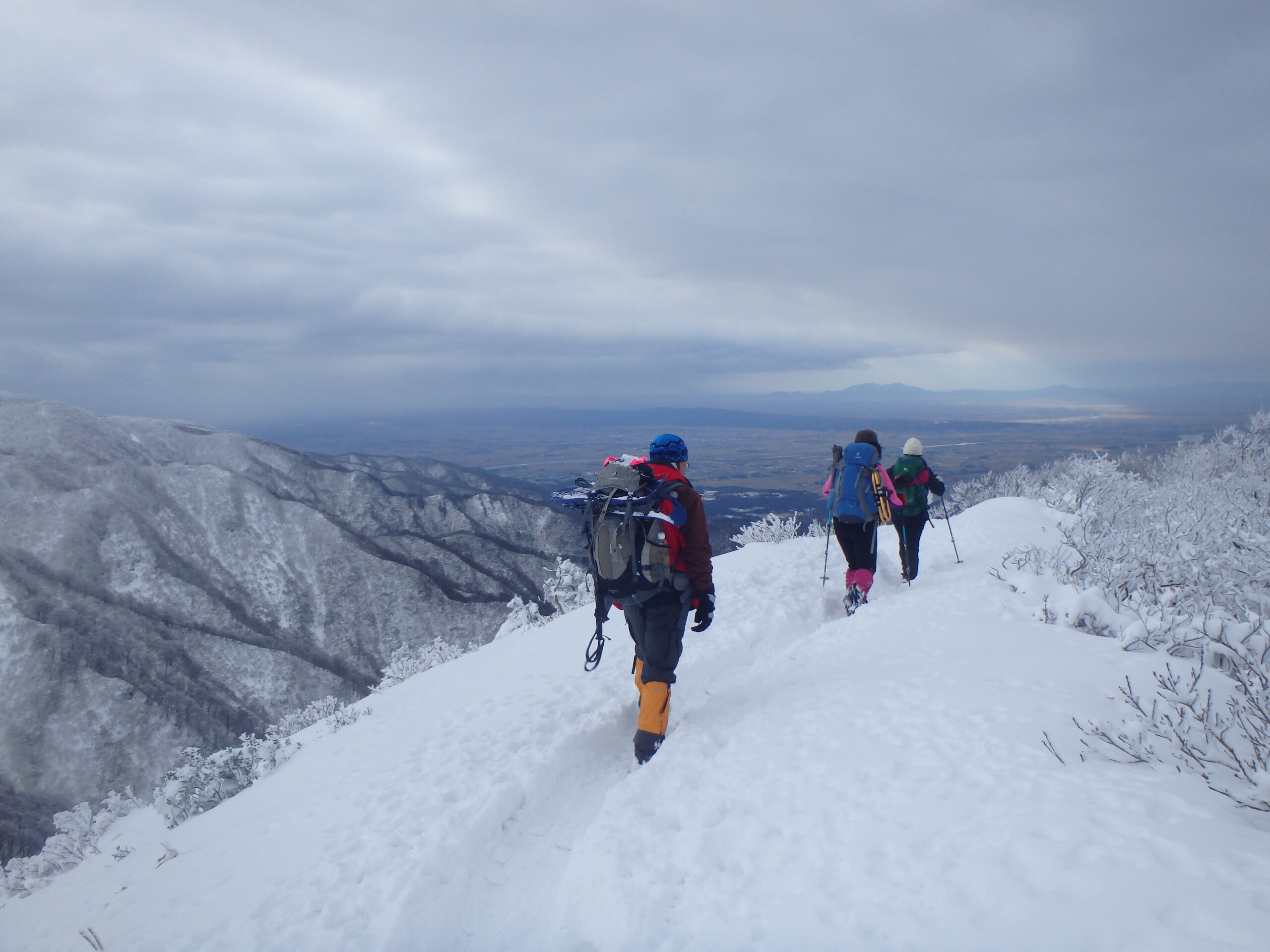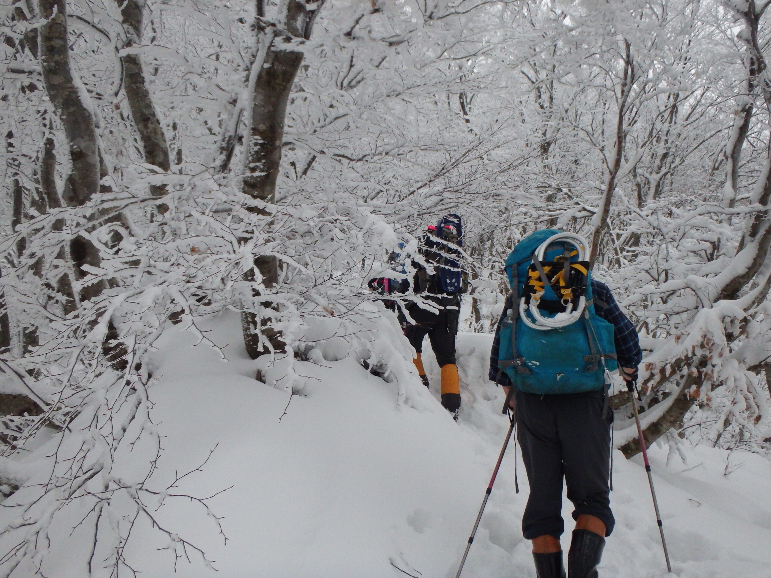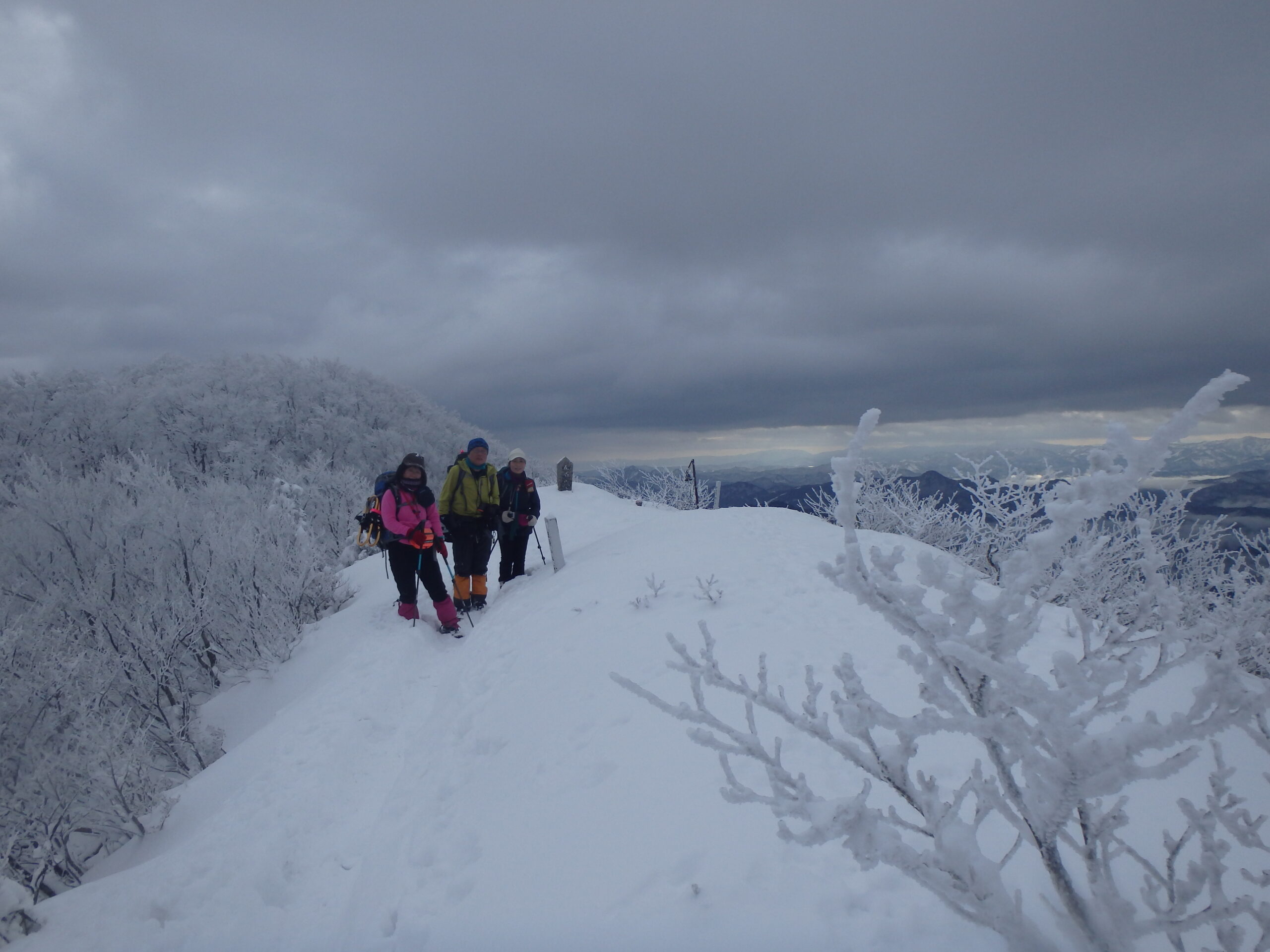 初登りの定番、五頭山。ただ今年は例年にない少雪で、一番奥の駐車場まで車が入れた。冬場にそこまで入れたのは初めてで、これ以降も無い。当然山にも雪は少なく、藪の上を歩く登行が藪の中になる場所も多かった。7:31奥の駐車場≫7:48三ノ峰登山口≫9:39三ノ峰≫10:07一ノ峰≫10:38三角点≫11:17二ノ峰(テントを張って昼食)≫13:14≫14:37三ノ峰登山口≫14:43駐車場