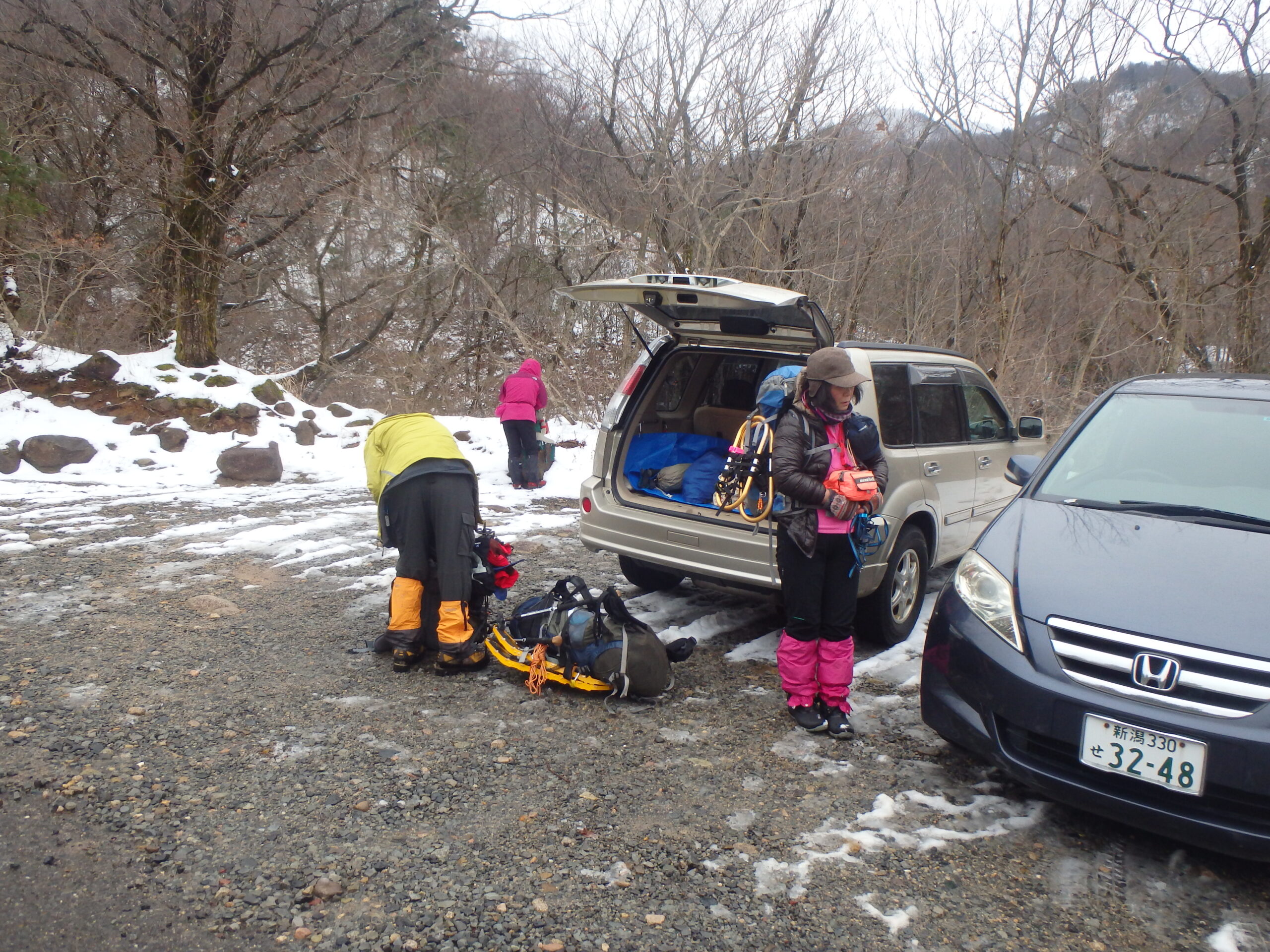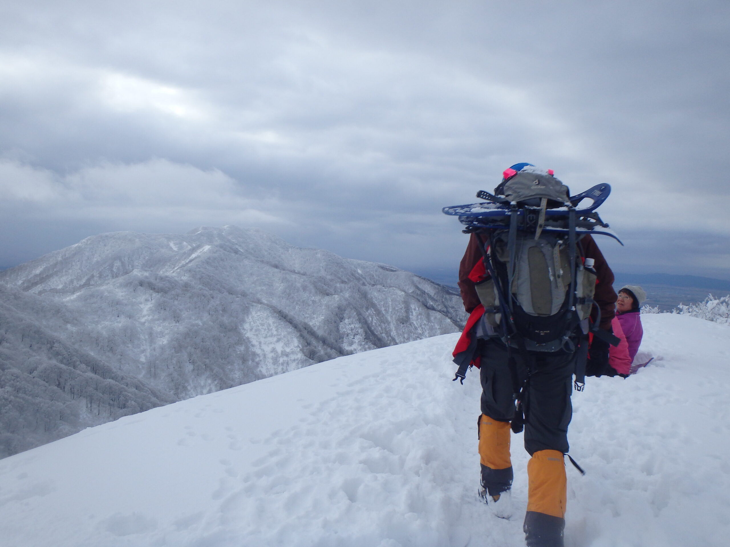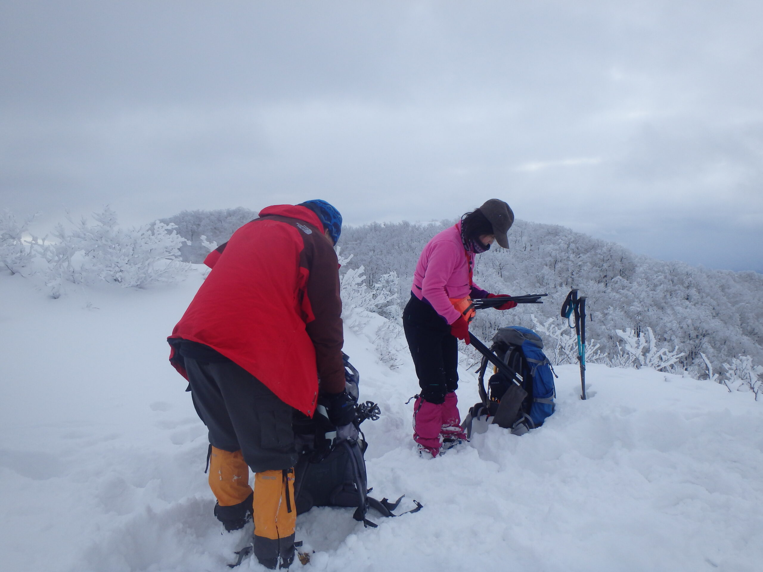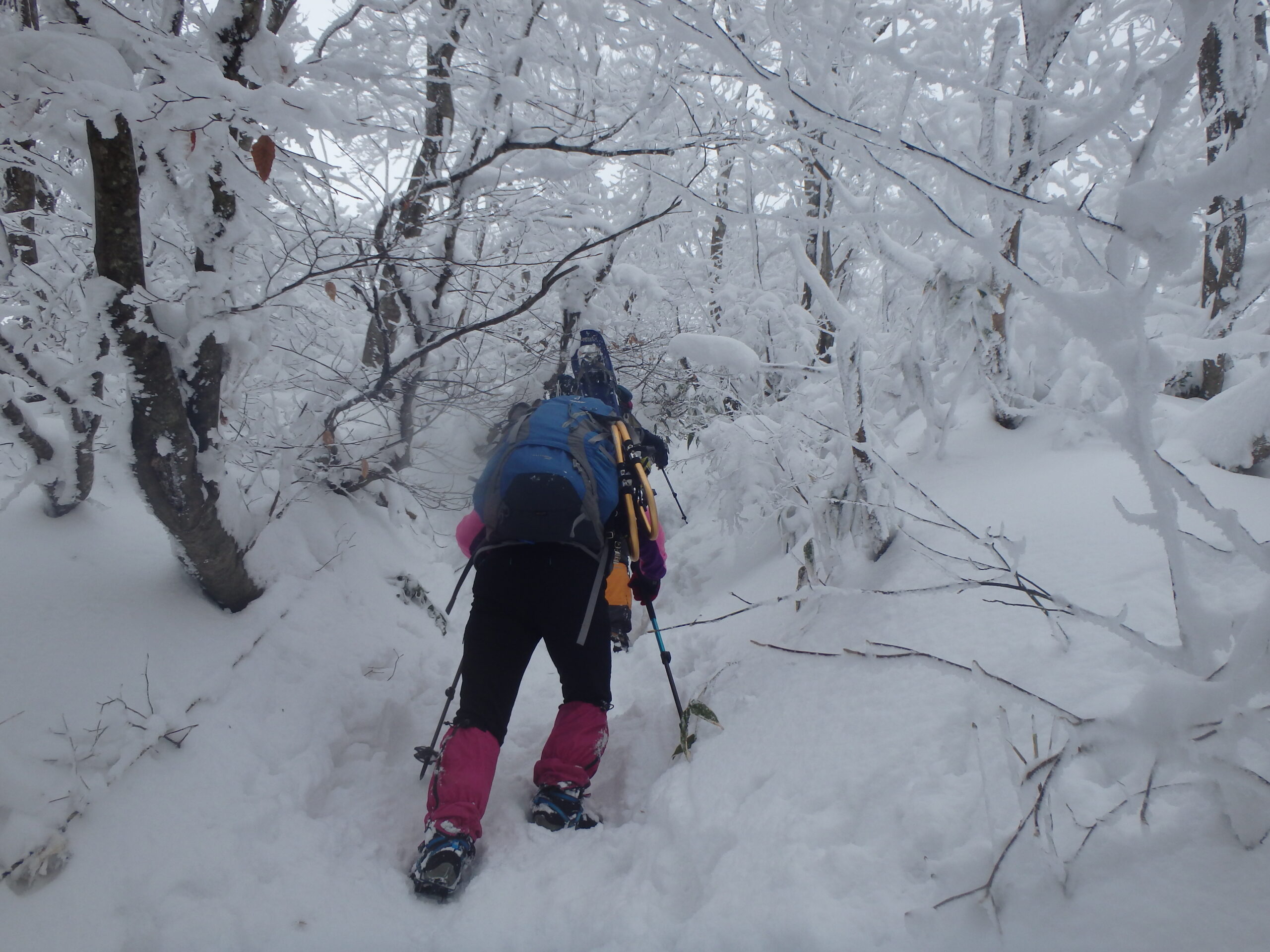 初登りの定番、五頭山。ただ今年は例年にない少雪で、一番奥の駐車場まで車が入れた。冬場にそこまで入れたのは初めてで、これ以降も無い。当然山にも雪は少なく、藪の上を歩く登行が藪の中になる場所も多かった。7:31奥の駐車場≫7:48三ノ峰登山口≫9:39三ノ峰≫10:07一ノ峰≫10:38三角点≫11:17二ノ峰(テントを張って昼食)≫13:14≫14:37三ノ峰登山口≫14:43駐車場