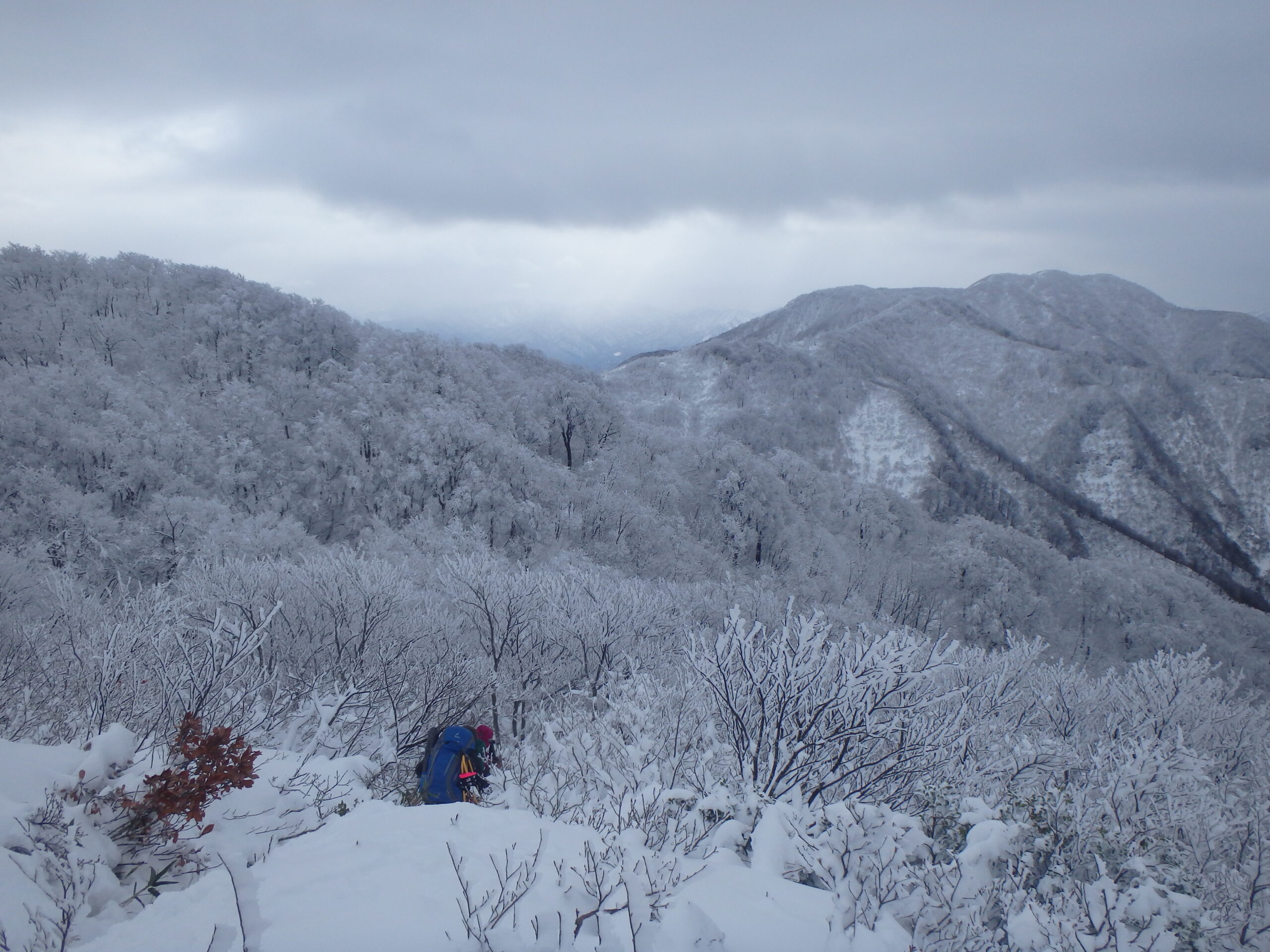 二ノ峰を下る。右奥に五頭山塊の最高峰菱ヶ岳
