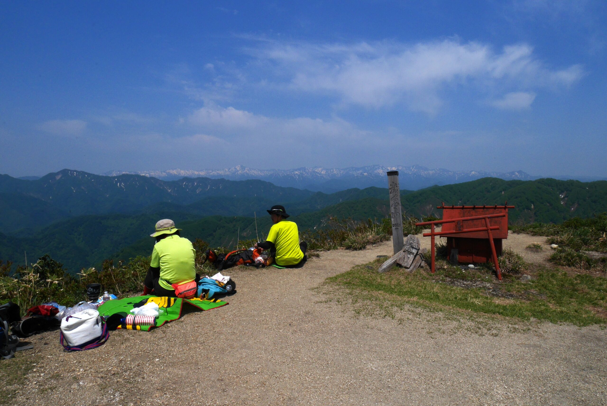 ほとんどの人は下山して山頂は静か。奥に朝日連峰、祝瓶から以東岳まで