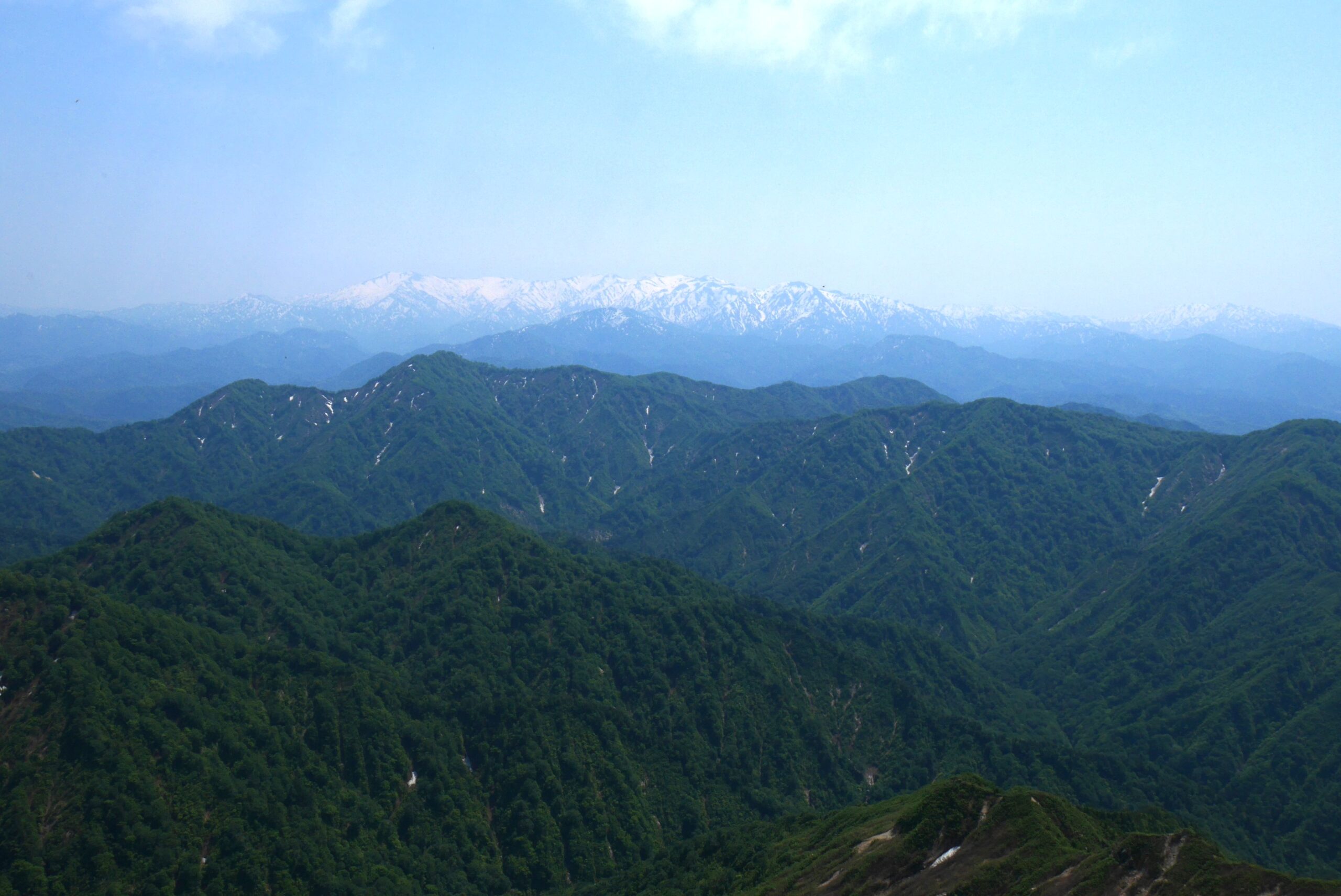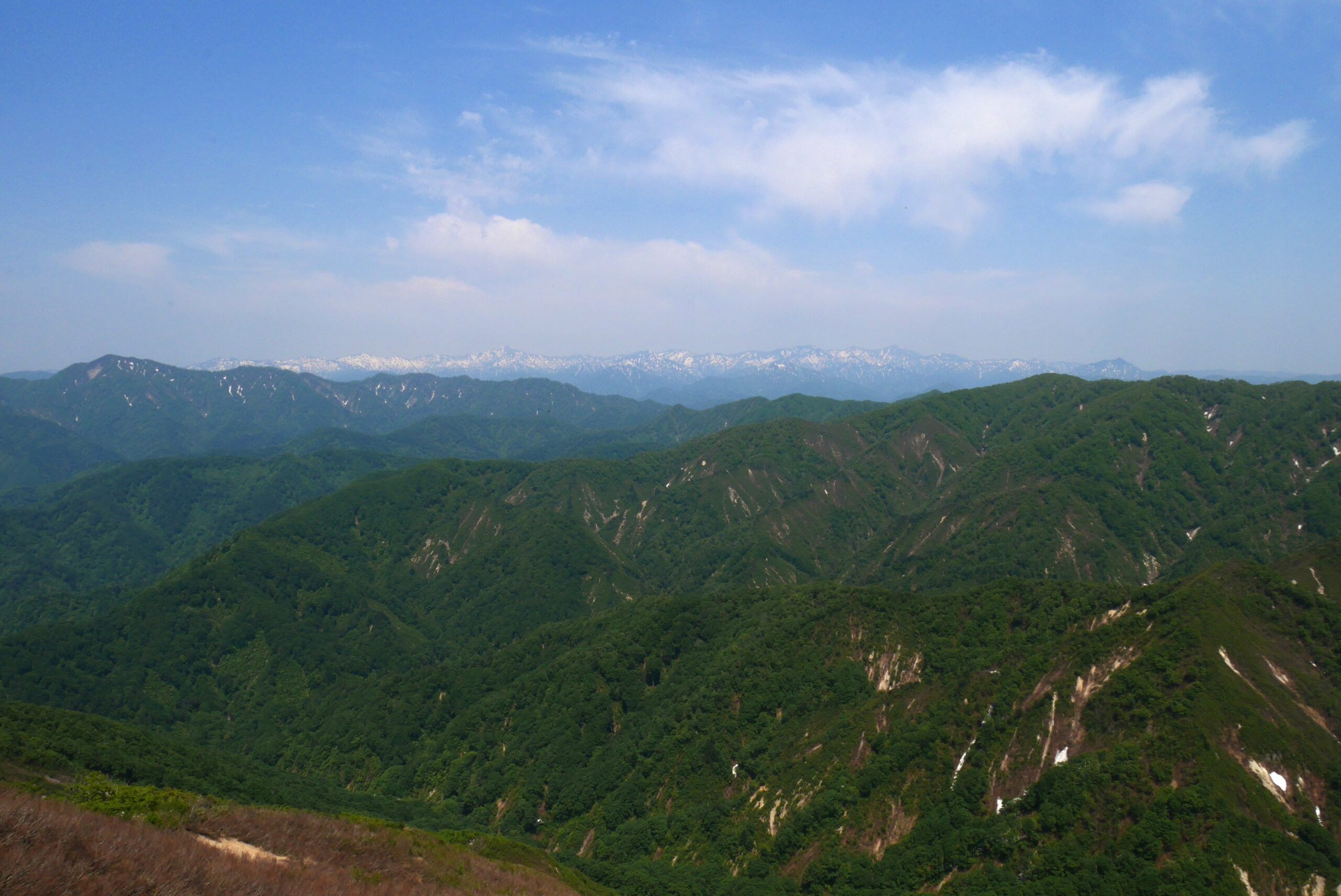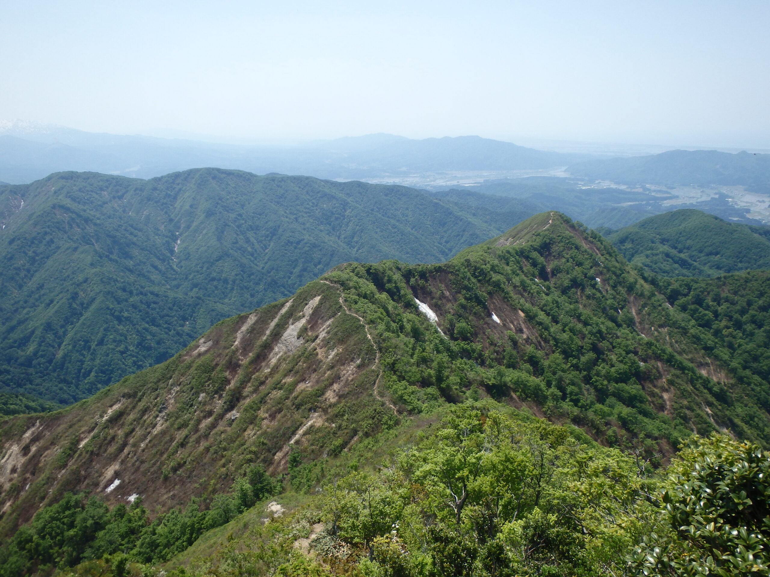 こちらは飯豊連峰。霞んで良く見えないが、飯豊本山はやや左に。