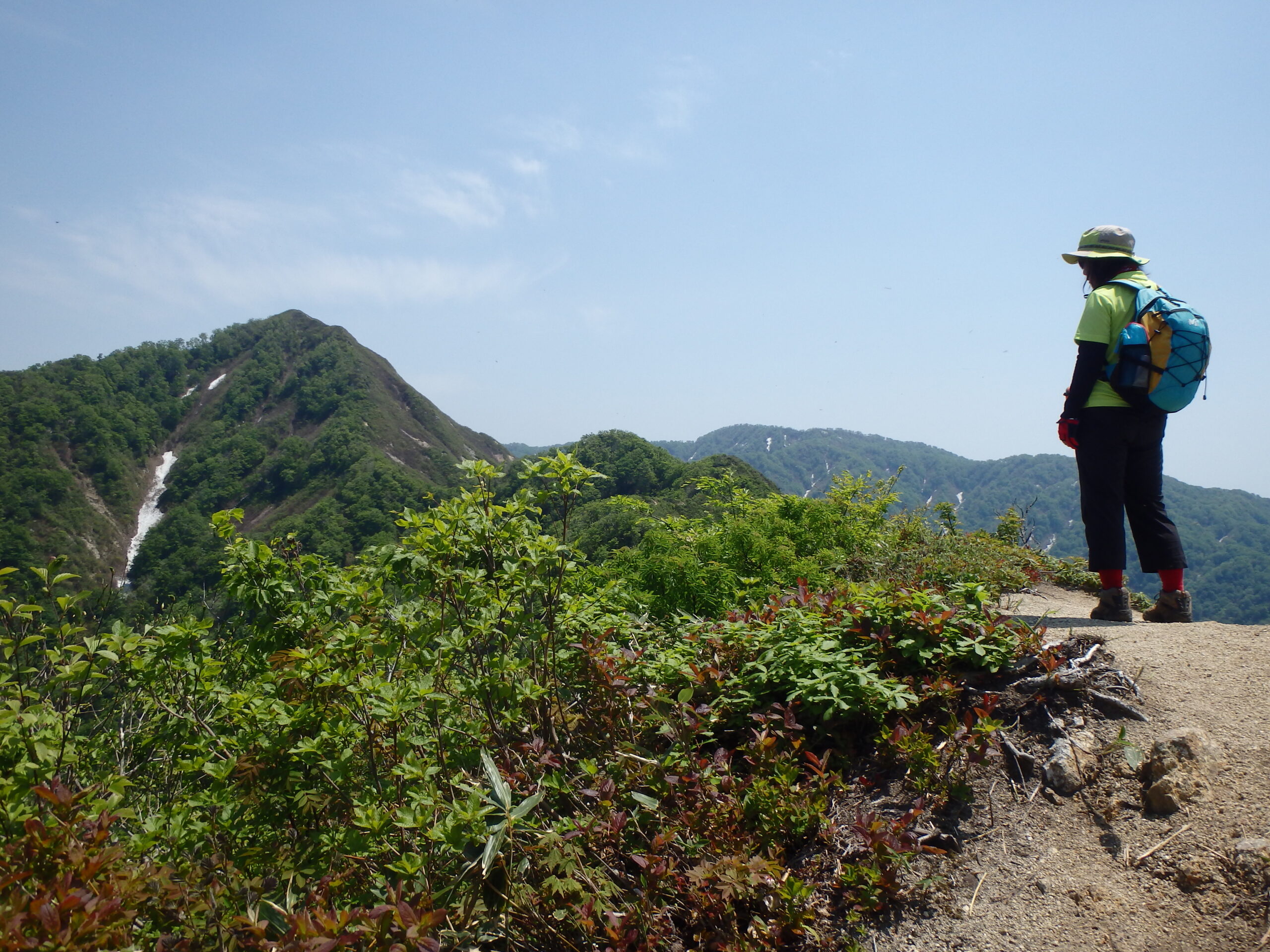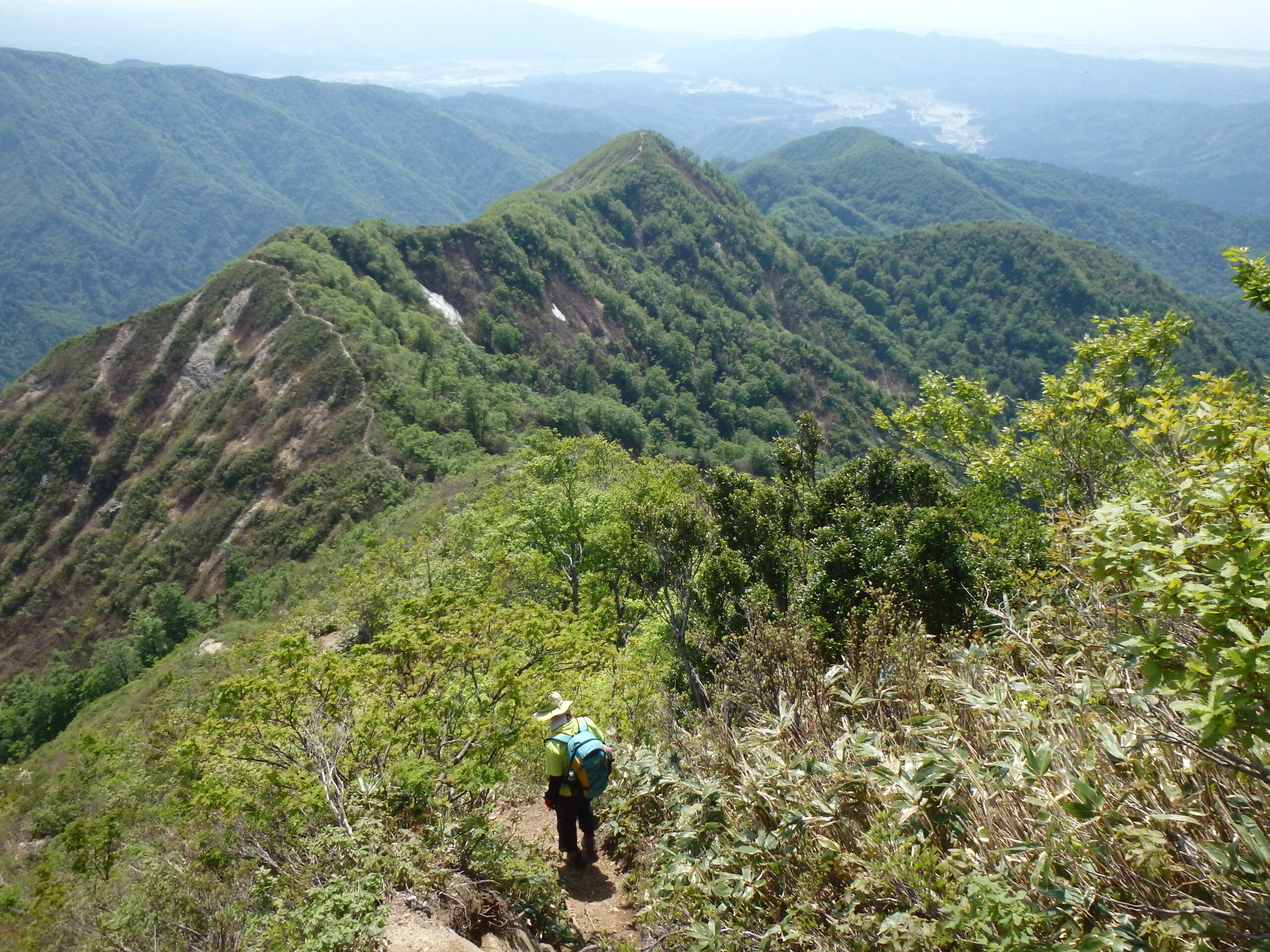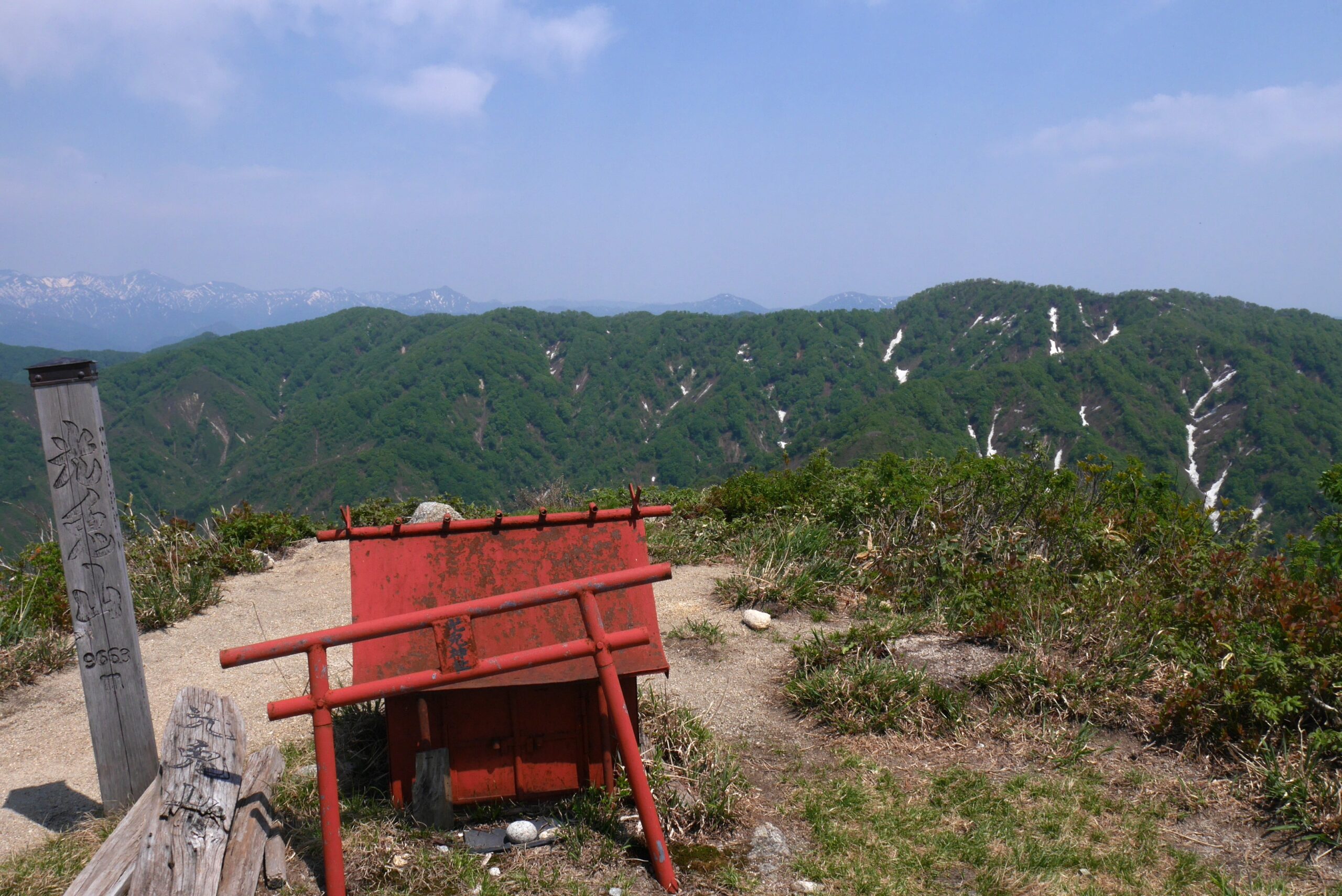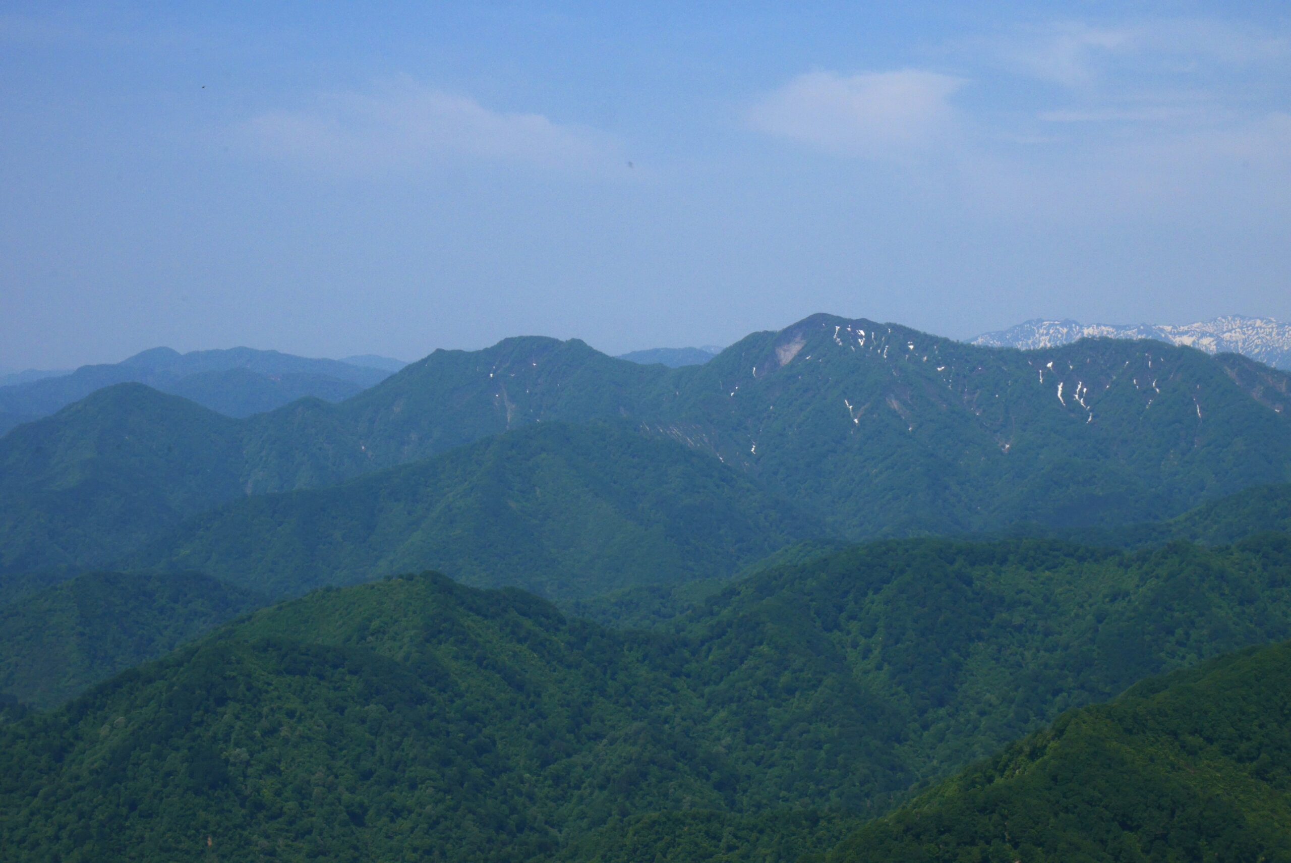 こちらは飯豊連峰。霞んで良く見えないが、飯豊本山はやや左に。