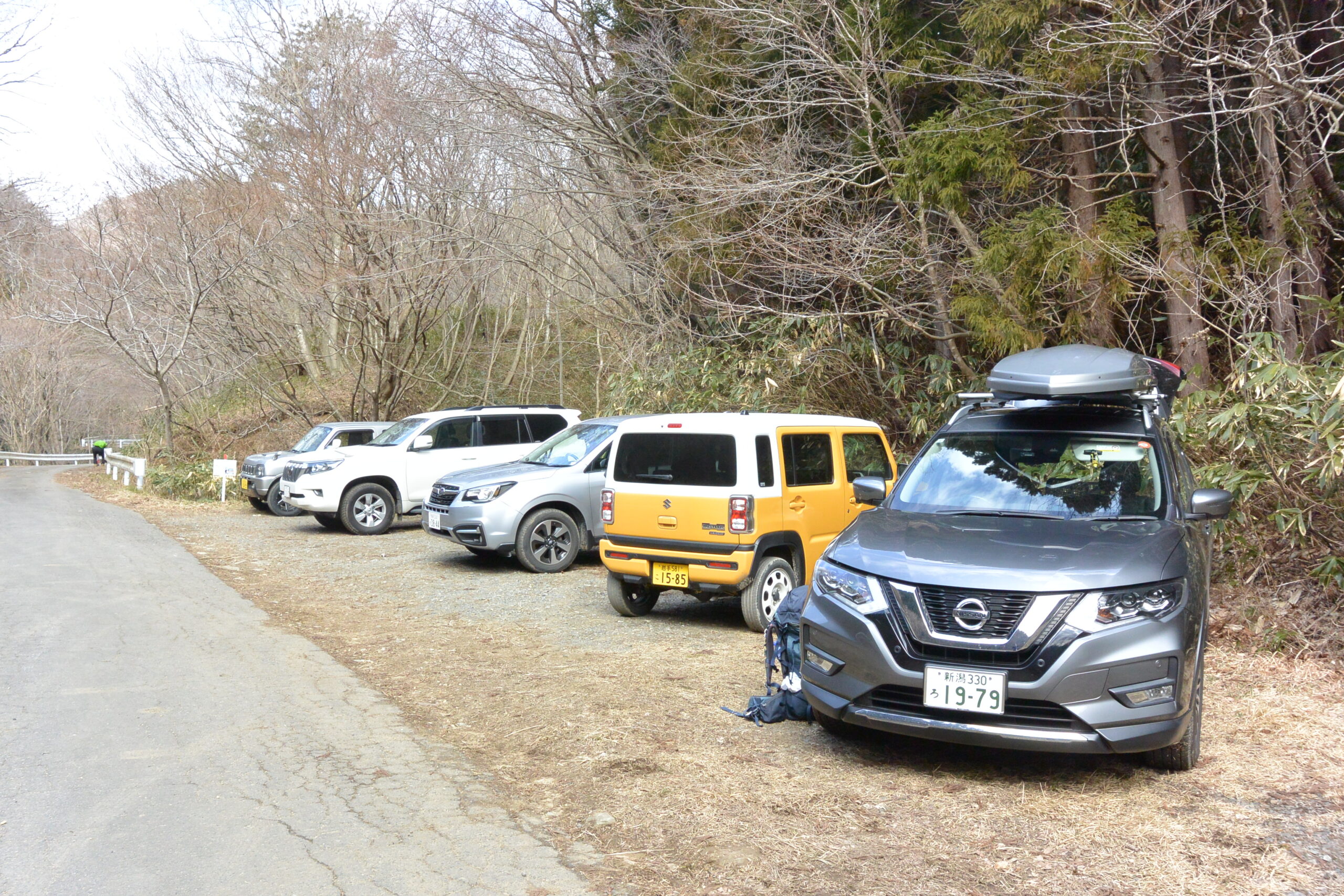 狭い道を通り抜けてようやく駐車場。県外の車も二台、それなりに知られた山のようだ。