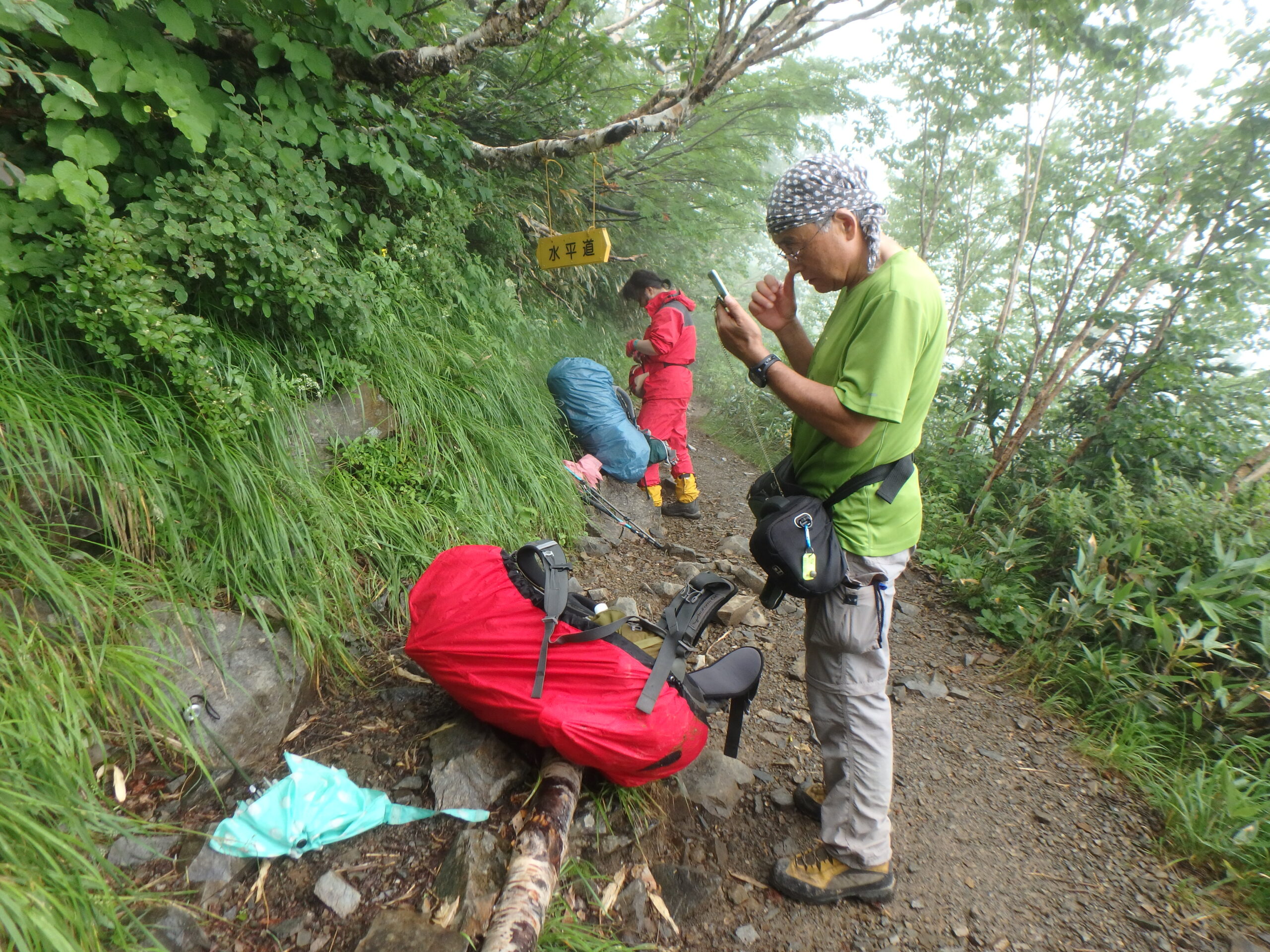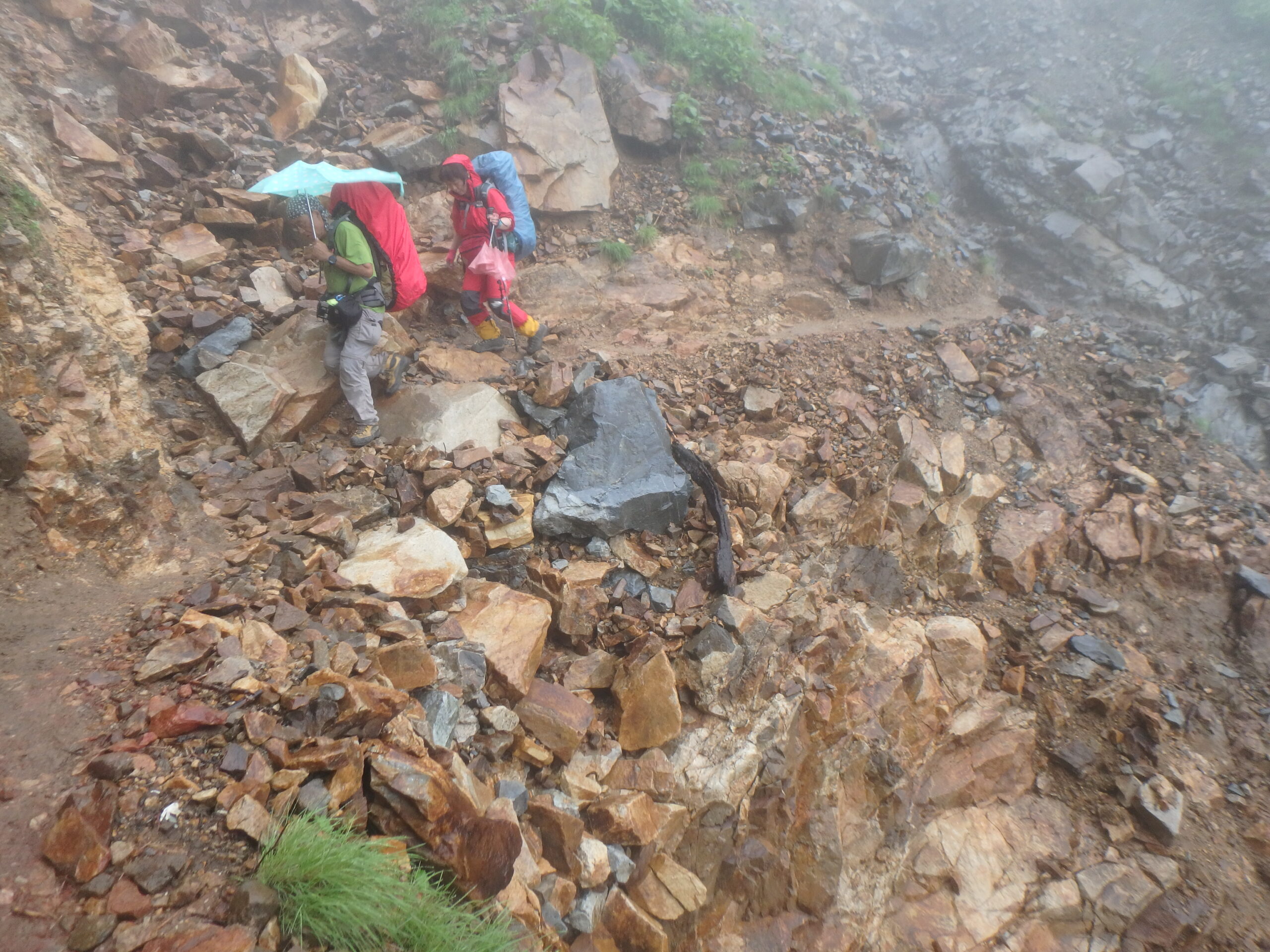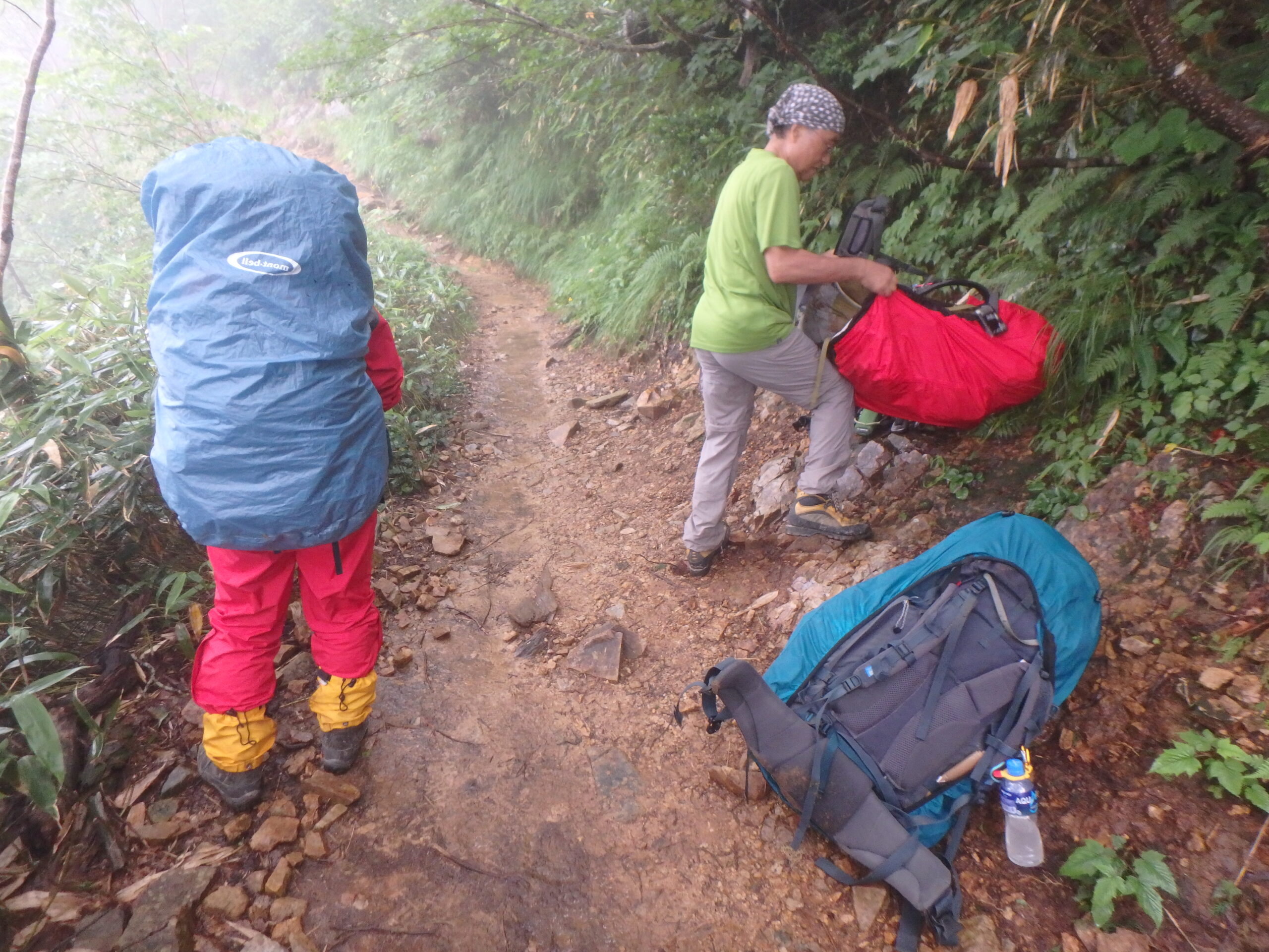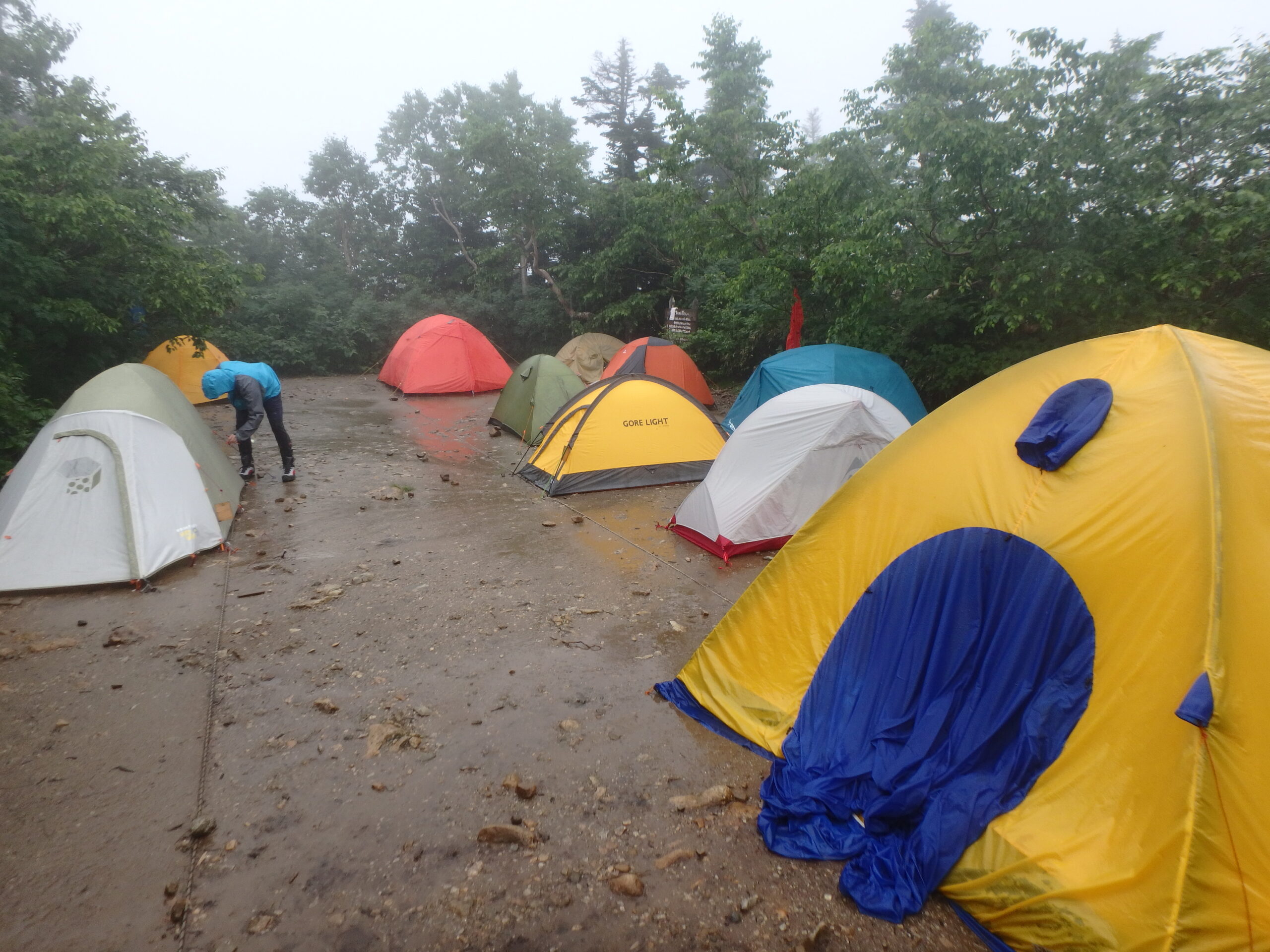 小雨降る中、大急ぎでテントを立てようとして、とんでもないことに気付く。僕の持ってきたテント本体が5人用テントでなく、3人用のテントだった。二人には5人用のポールとフライシートを渡してあるので、サイズが合わない。前回の剱山行の後、テントを干し、しまう際に入れる袋を間違えたのだ。自分のとんでもないミスで、どうしようかと困惑したが、二人が先ず立ててみようというので立てたテントがこれ。本体が小さいのでポールが前にだいぶ出ているが、自立するのでこれで良しとした。それにしてもテント歴15年で初めてのミス。申し訳なさと感謝の山行となった。特に共同装備は怠りなく点検しなければならない。