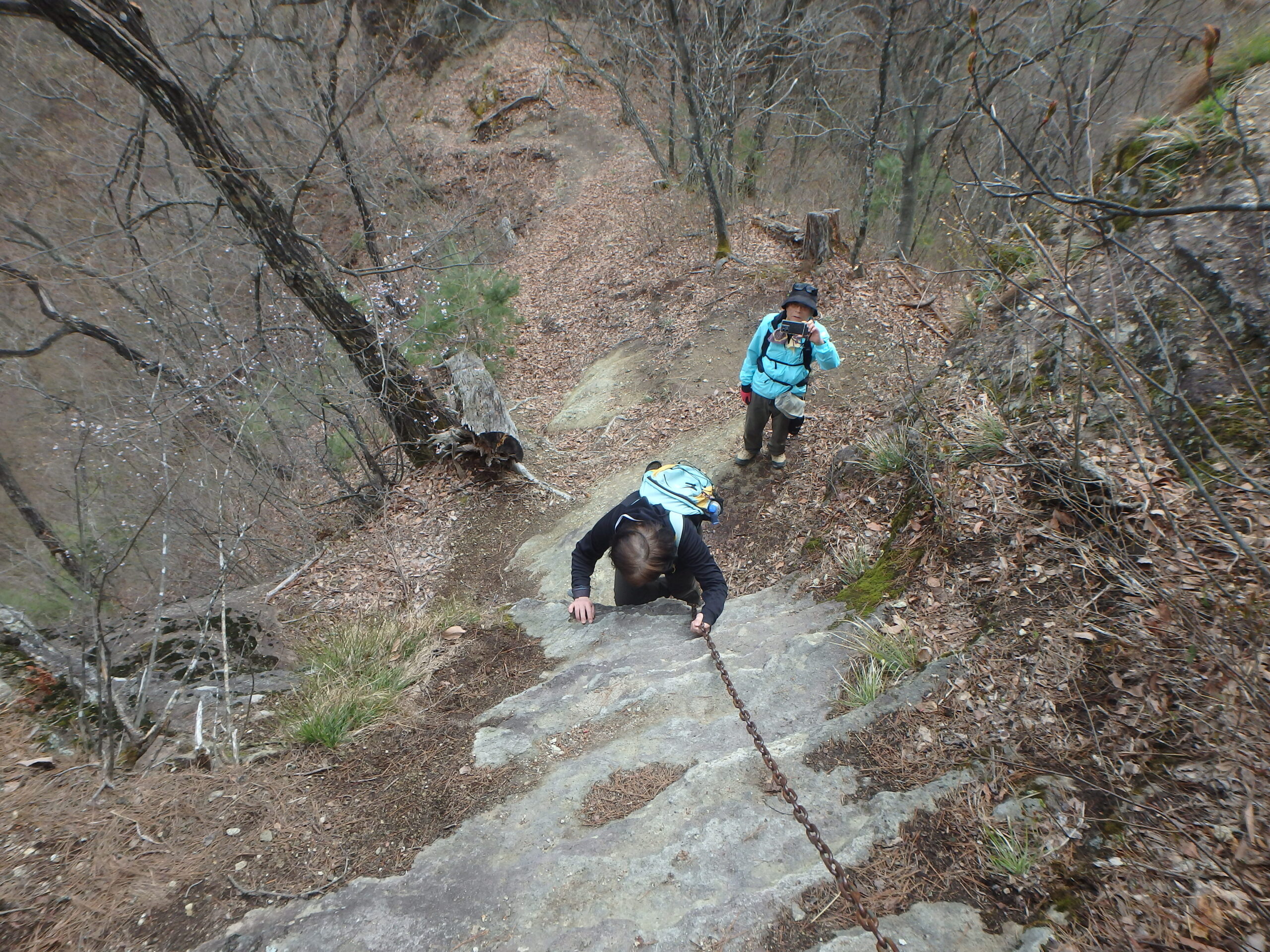 紙飛ばし岩の裏側は獅子岩で、この長い鎖場を登ると紙飛ばし岩の上