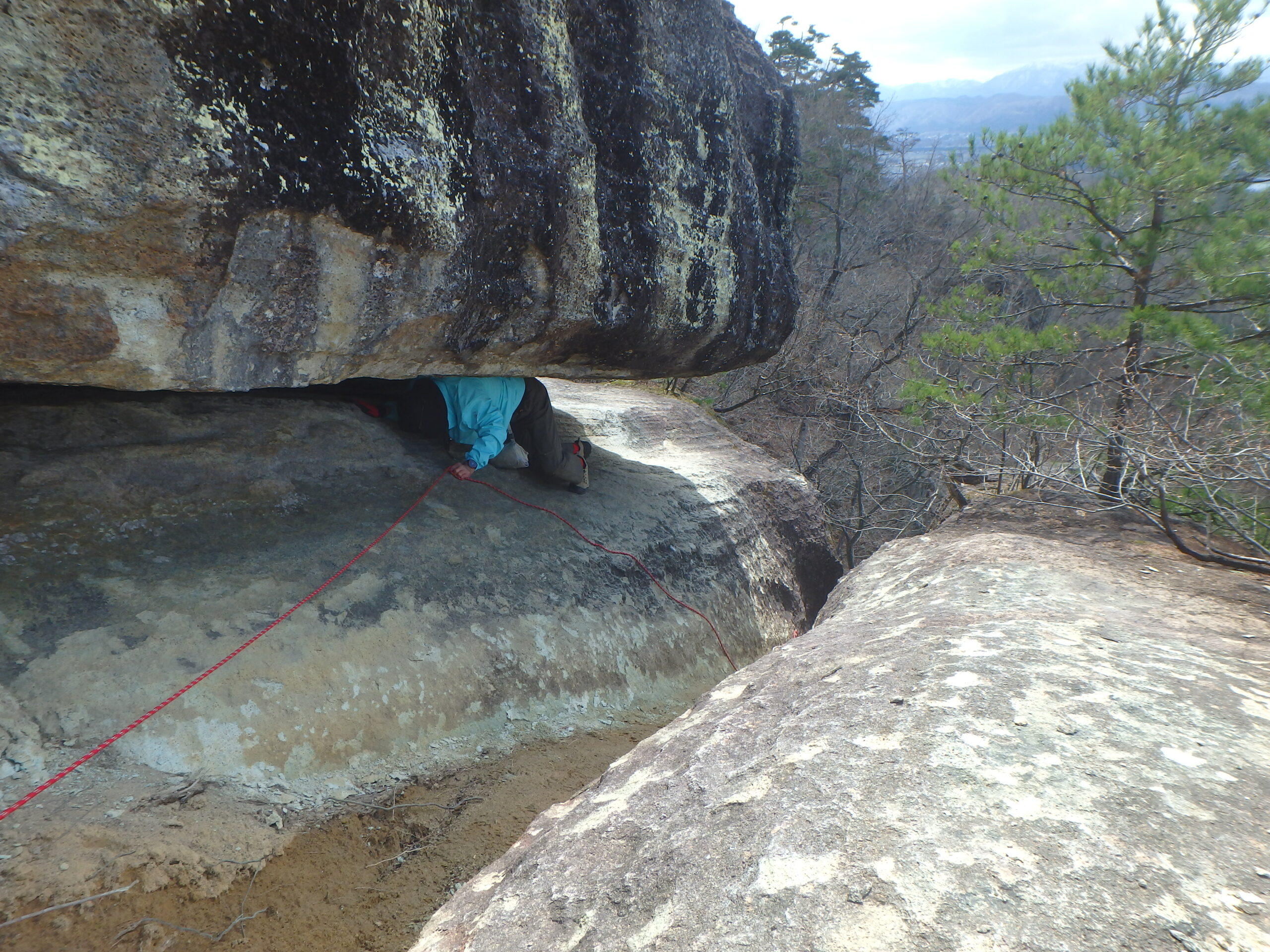 獅子岩へ登る時はこの岩の隙間を抜ける。右の岩の隙間に左足を置くのだが、なかなか届かないので、安全のためロープを張ってみた。