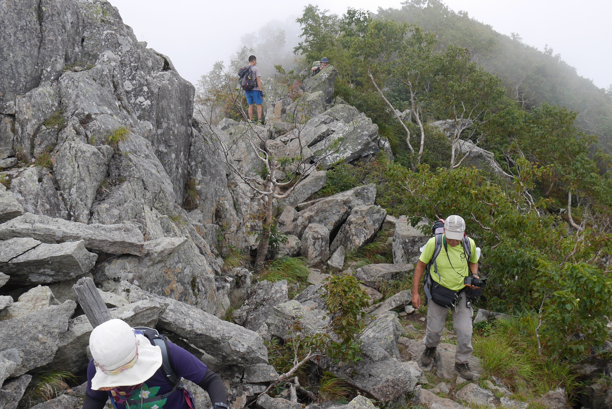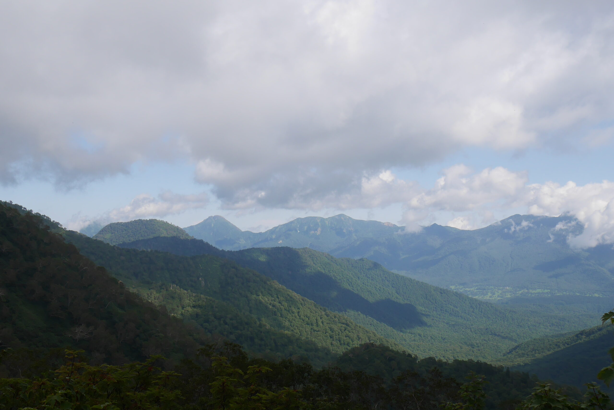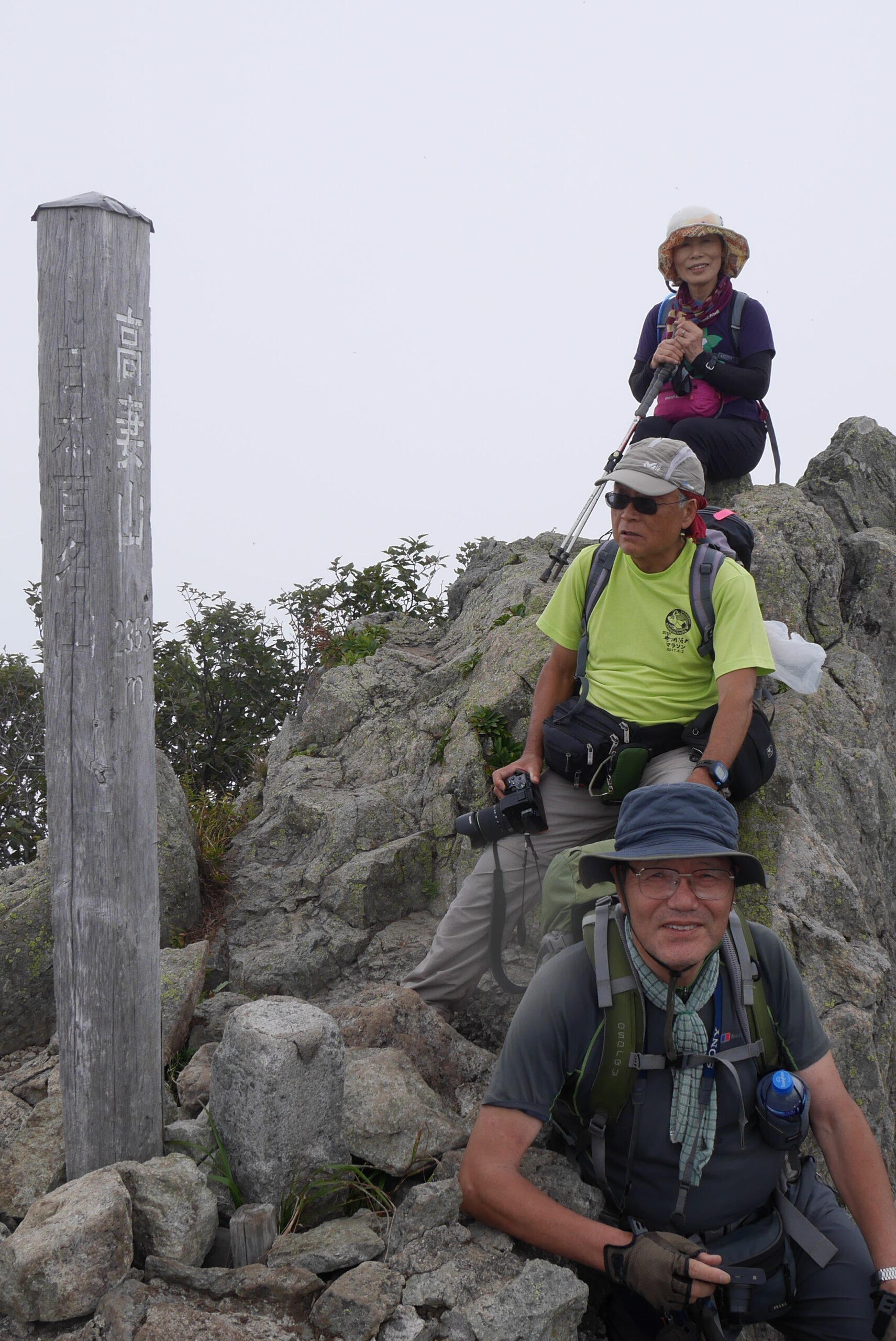 この4年前、2013年10月に来た時は後ろ立山方面も良く見えたと記憶していたが、今改めてその時の写真を見てみると、霞んでいて山の特定は難しい。ただ裏の乙妻の方には雨飾山が良く見えたのでその写真を下に挙げた。もう一枚は今回通らなかった四普賢辺りからの高妻山。